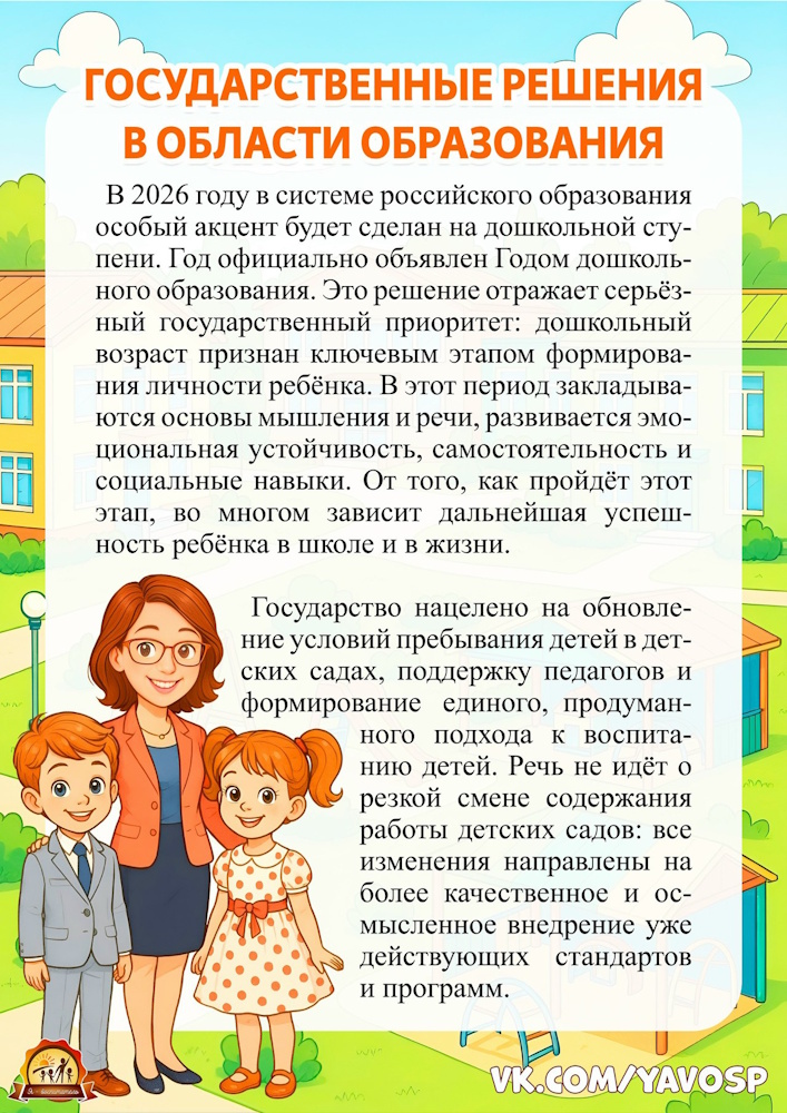 2026 год объявлен Министерством просвещения России Годом дошкольного образования. Инициатива направлена на повышение качества воспитания и развития дошкольников, улучшение инфраструктуры детских садов и поддержку педагогов.