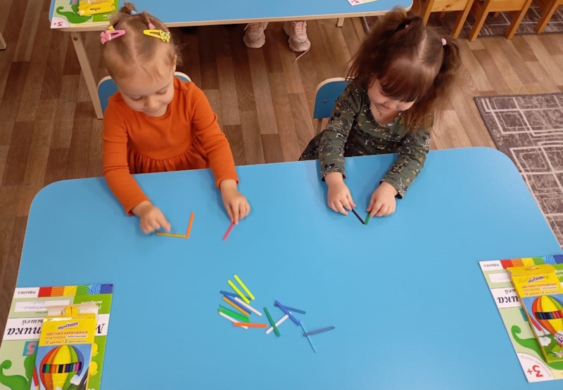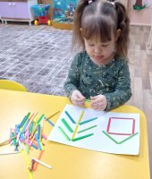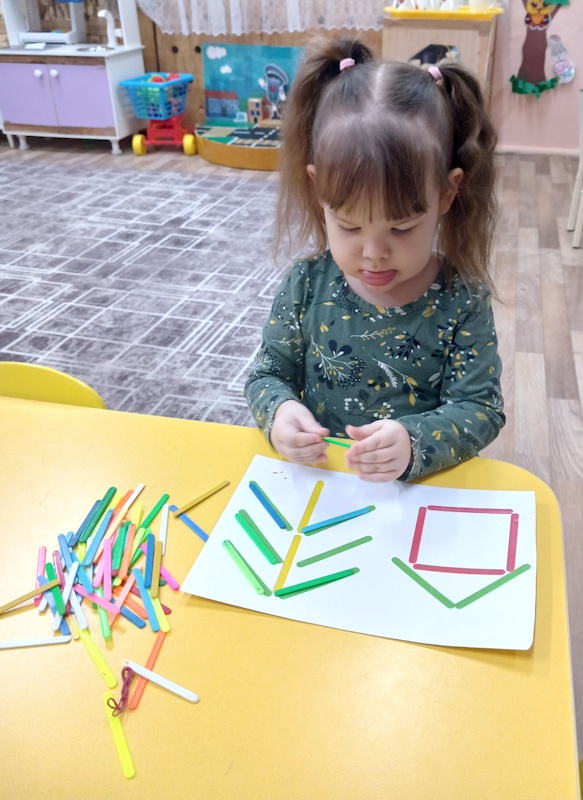 Дети учатся узнавать и называть цвета, при помощи игр: «Собери гусеницу», «Разноцветные платочки». Знакомятся с геометрическими фигурами (круг, квадрат, треугольник), учатся определять и сходства, и отличия. С помощью палочек складывают геометрические фигуры. Игры: «Большие и маленькие предметы», Длинный-короткий», «Узкий широкий» помогают научить детей сравнивать предметы по величине.
