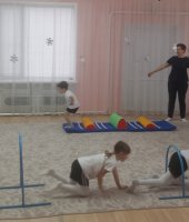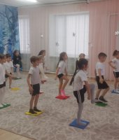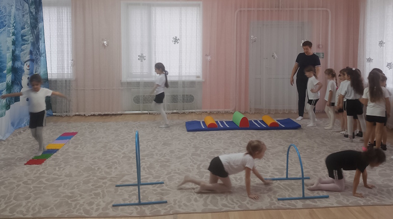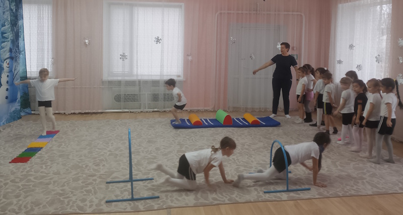 Общеразвивающие упражнения выполнялись на балансирах, что способствовало профилактике плоскостопия у детей. В основной части занятия дети закрепляли прыжки через бревна, ходьбу на носках, проползание по дугами разной высоты. В конце основной части занятия была проведена подвижная игра «Мороз - Красный нос», которая создала физиологическую и эмоциональную нагрузку на занятии. В заключительной части занятия была проведена игра малой подвижности на внимание «Передал, садись».