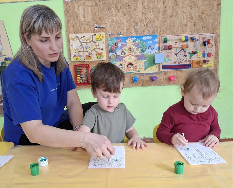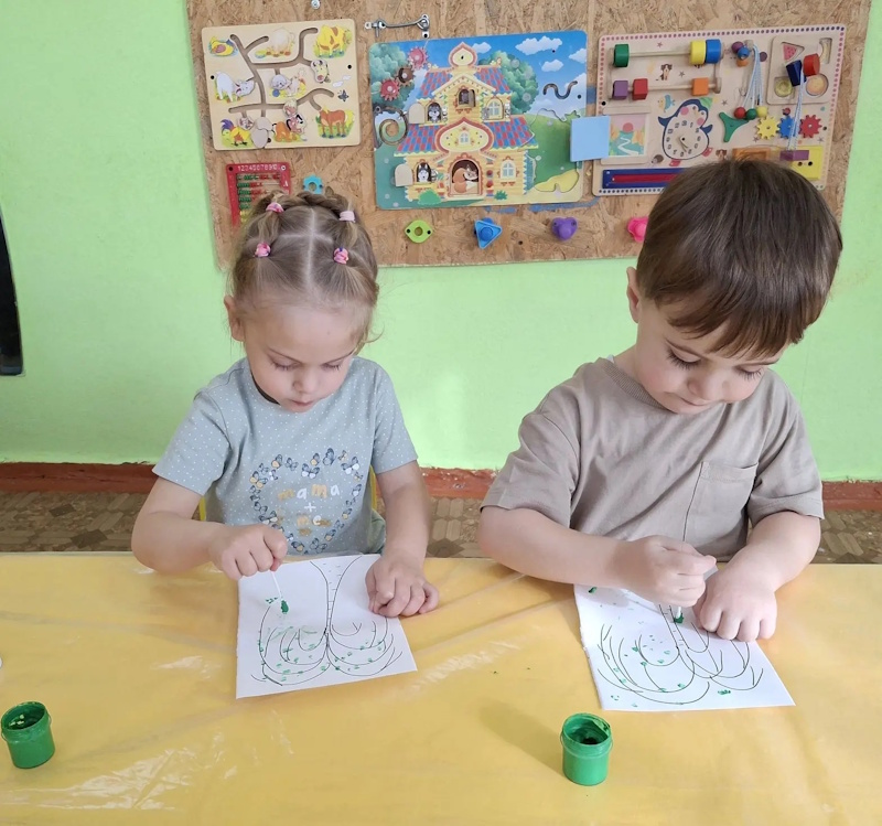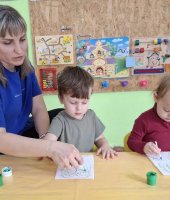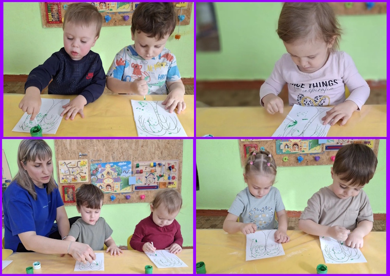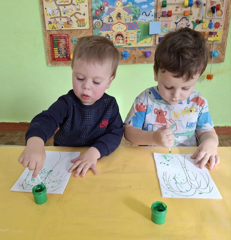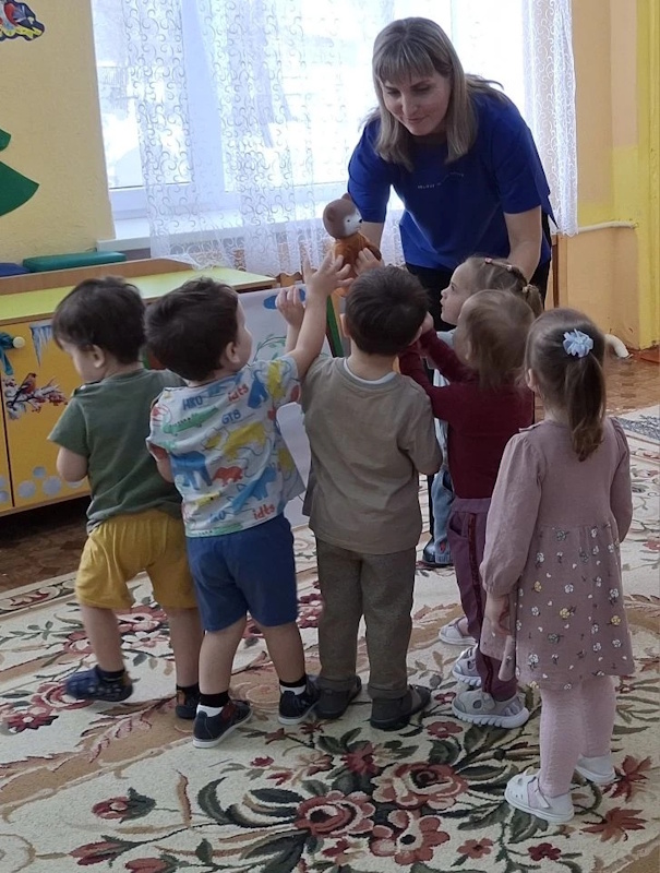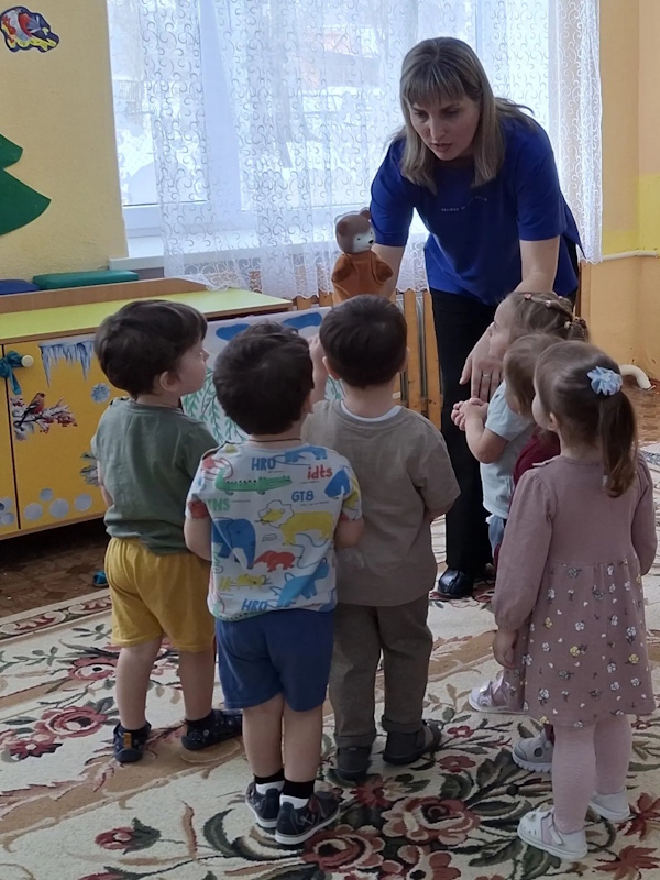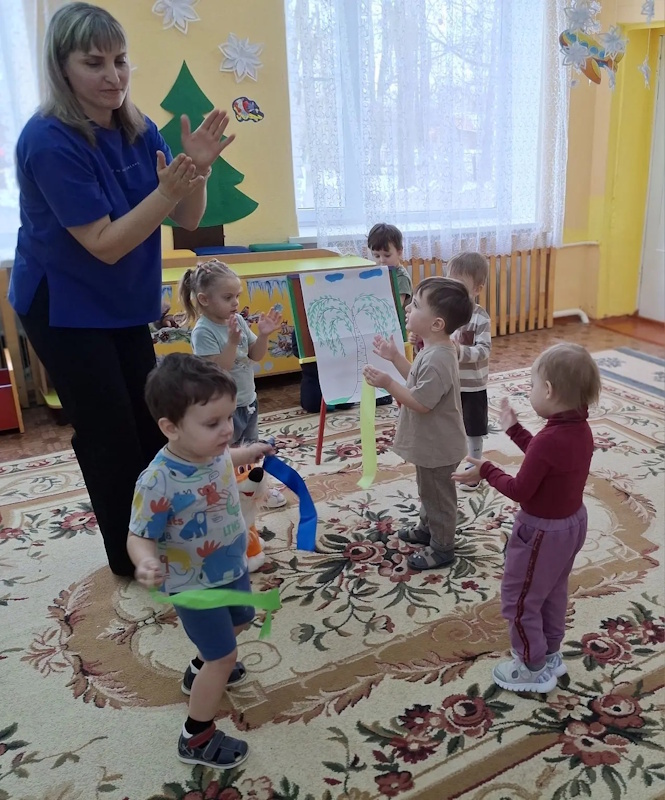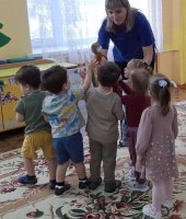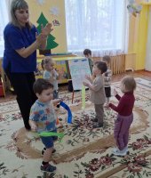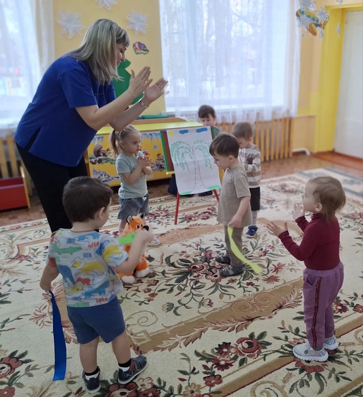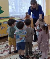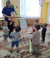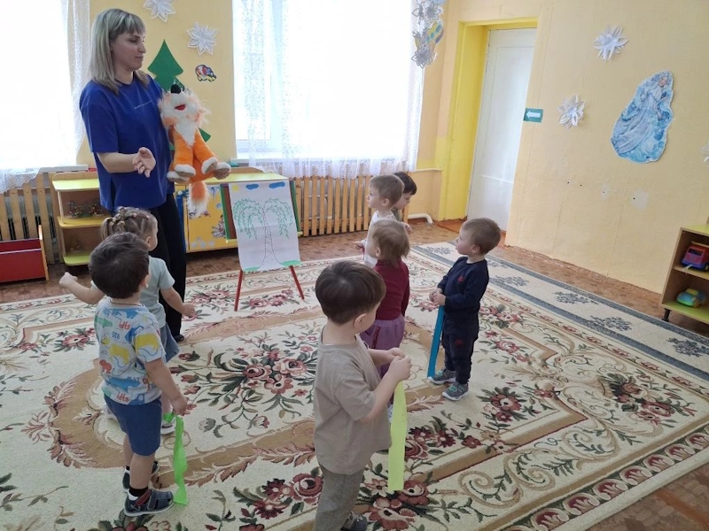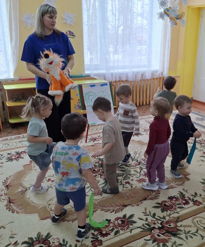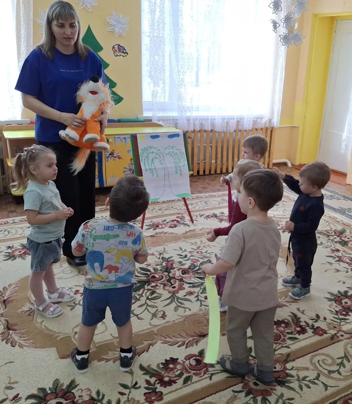 В ранней группе «Лучики» я провела досуг посвящённый знакомству детей с символом России - русской берёзой. Малыши встретили лисичку, которая сидела под берёзкой и рассказала почему берёзку называют символом России. После чего малыши вместе лисичкой пошли танцевать танец с ленточками. Услышав веселье - к малышам присоединился мишка, и предложил поиграть возле берёзки в подвижную игру «У медведя во бору». Итогом стало рисование для берёзки подружек - берёзок.