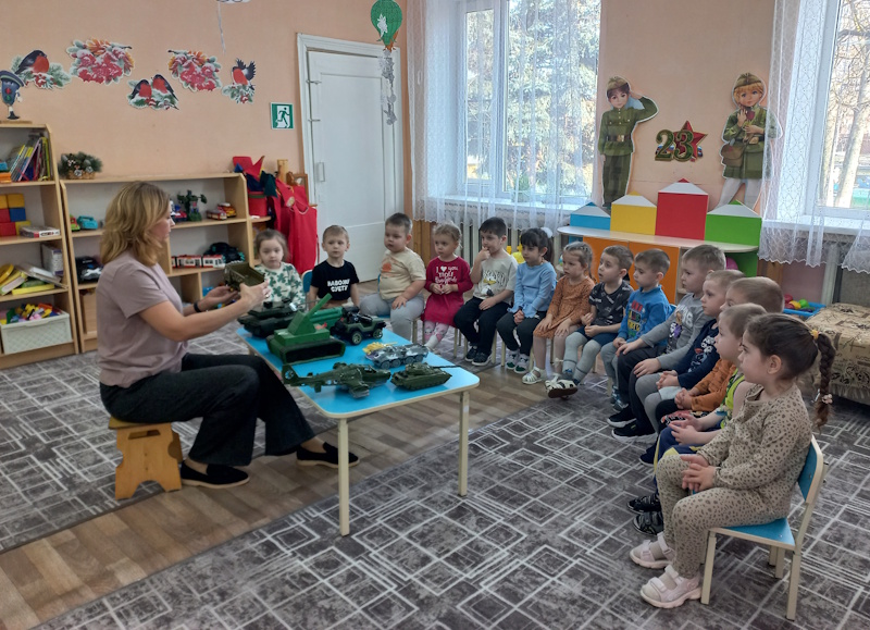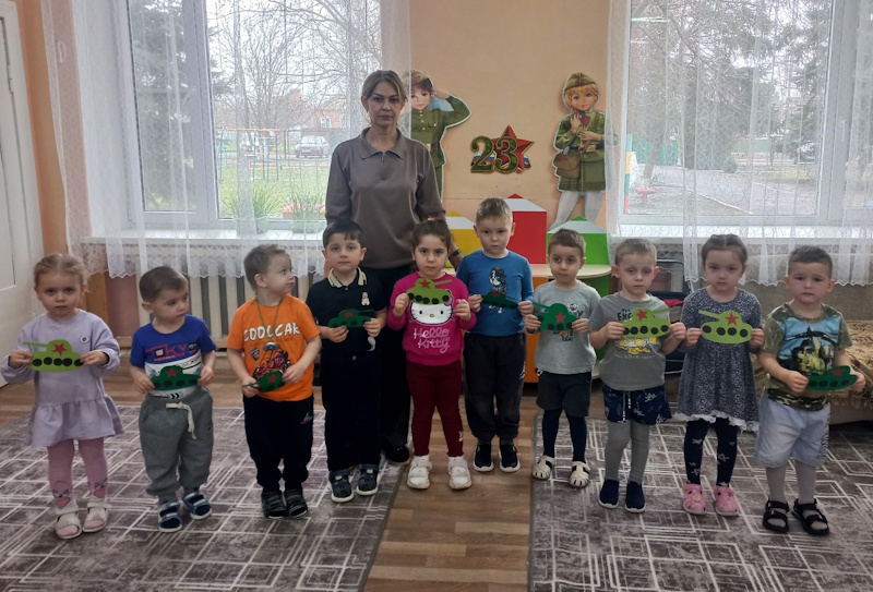 В младшей группе «Капельки» в преддверии праздника 23 февраля прошла тематическая неделя «День защитника Отечества». С детыми проводились различные мероприятия: беседы, в ходе которых дети более подробно узнали о том, кто такие защитники Отечества, рассматривали военную технику, познакомились с военными профессиями. В совместной деятельности с детьми слепили самолеты, сделали танк. Играли в подвижные игры «Самолеты», «Туннель».