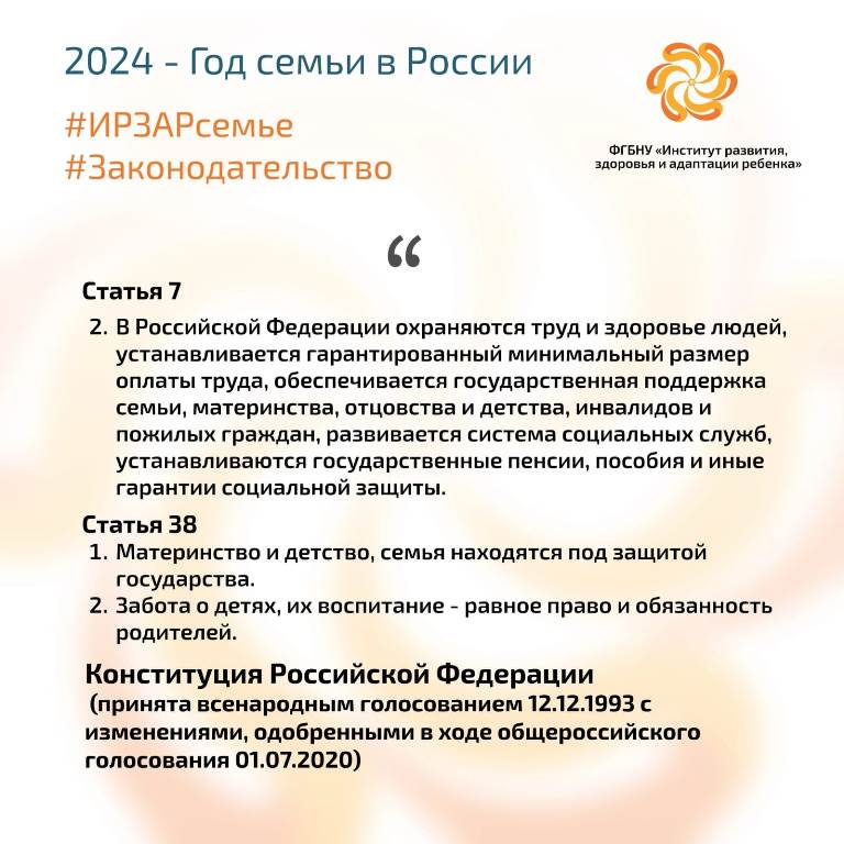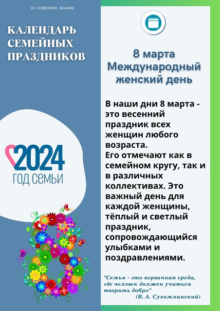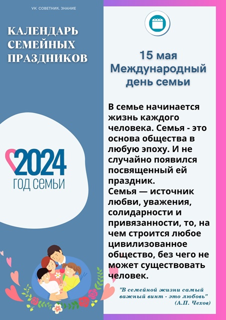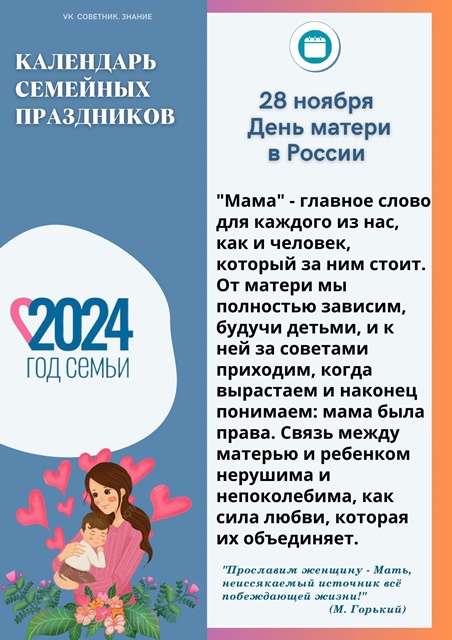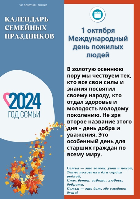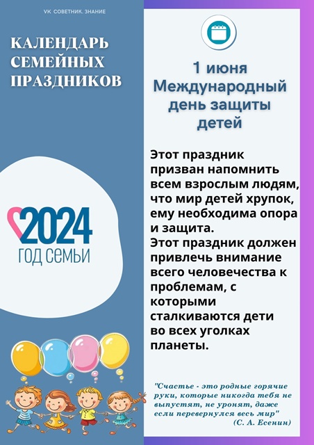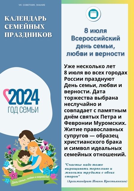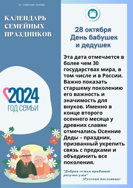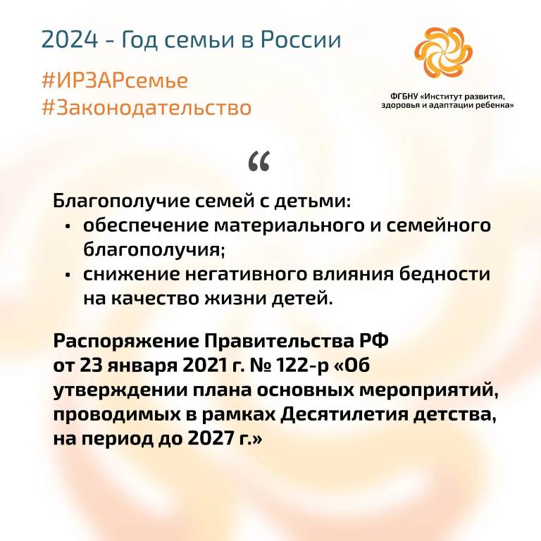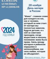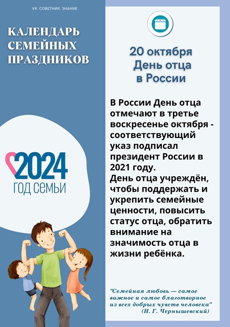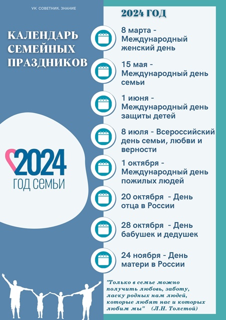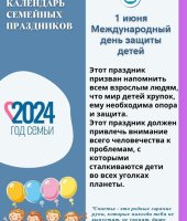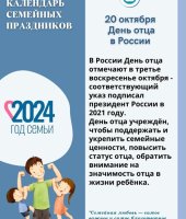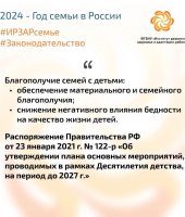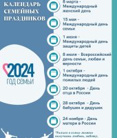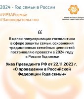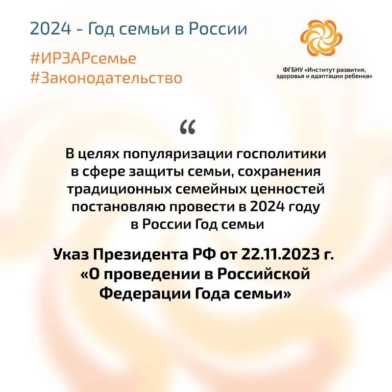 Указом Президента Российской Федерации от 22.11.2023 № 875 2024 год объявлен Годом семьи. Решение было принято в целях популяризации государственной политики в сфере защиты семьи, сохранения традиционных ценностей.