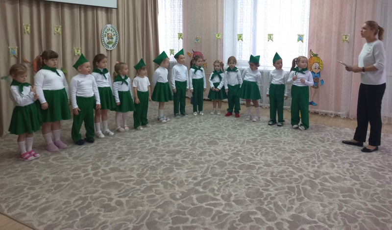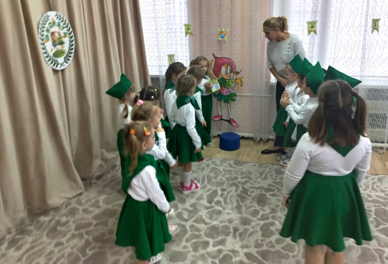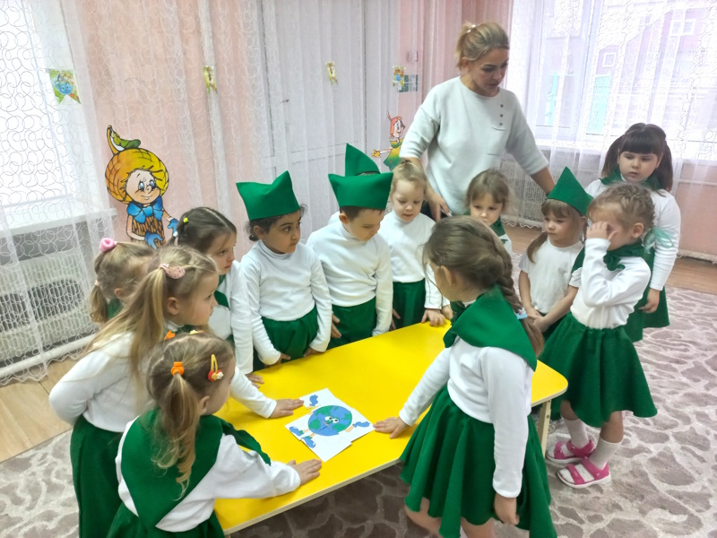 В группу пришло письмо от матушки природы, в котором она обратилась за помощью к Эколятам - дошколятам. Ребятам нужно было отправиться в лес, где их ждали сказочные помощники: Шалун, Умница, Тихоня и Елочка. У каждого из них было задание для юных эколят, нужно было найти животным их домики, назвать художников (времена года), собрать пазлы животных, вспомнить правила поведения в лесу, станцевать задорный танец. За каждое выполненное задание Эколята получали часть пазла, собрав пазл получилась планета Земля.