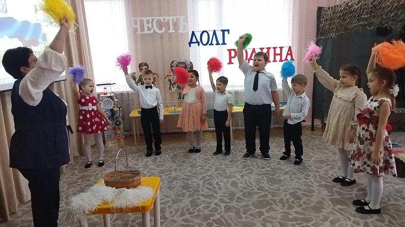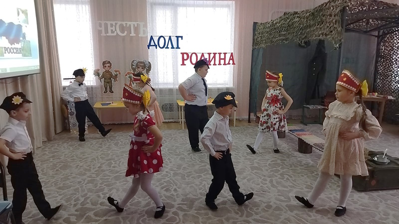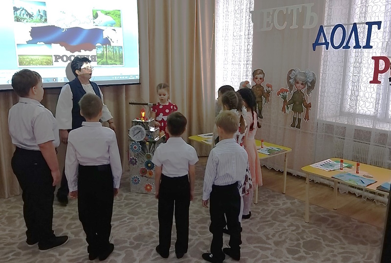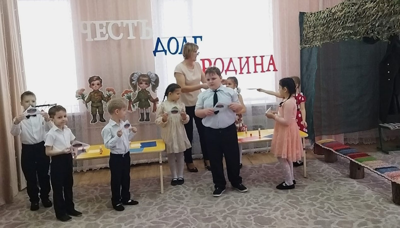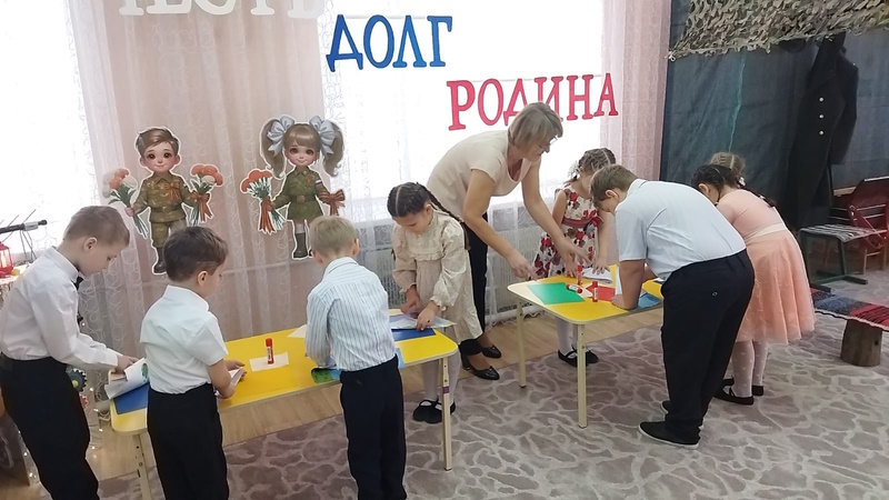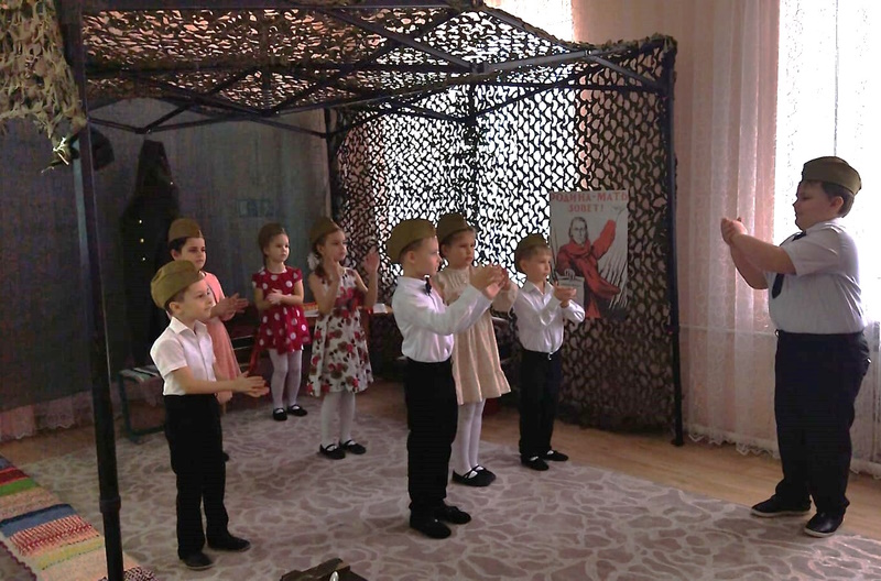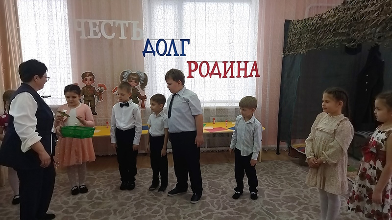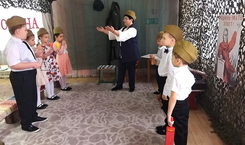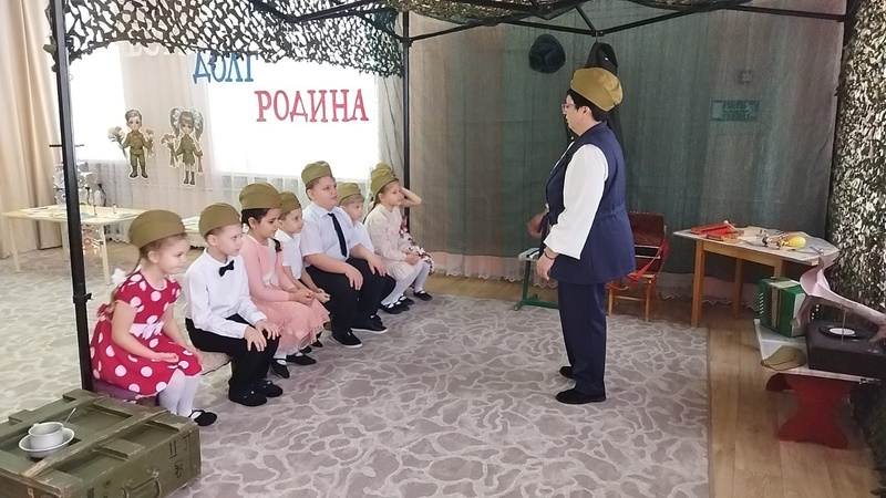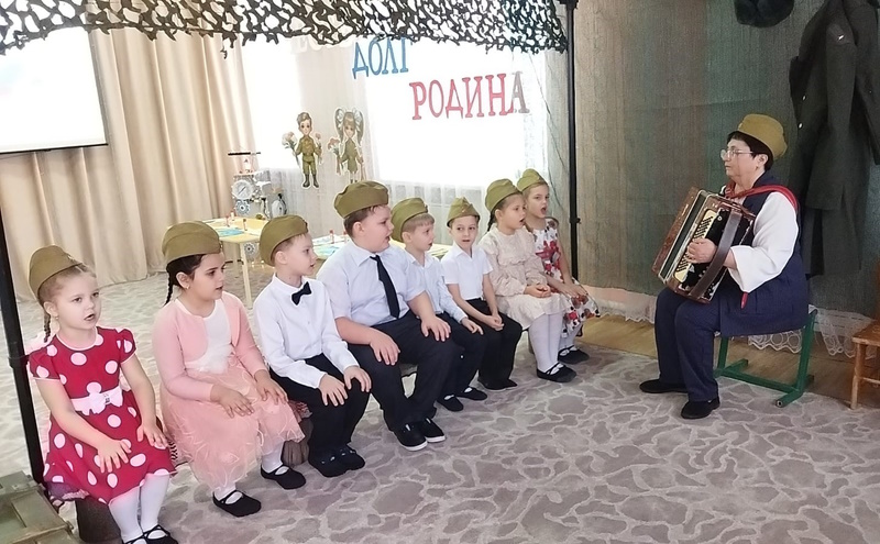 Воспитанники с Ларисой Викторовной при помощи машины времени и волшебной песенки: «До, ре, ми, фа, соль, ля, си, ты нас в прошлое неси» отправились в военные годы. Ребята оказались в военной палатке, где всё вокруг напоминало о военном времени. Одев пилотки, ребята слушали произведение «Священная война, рассмотрели плакат «Родина – Мать зовет!» и высказали своё видение о нём. Как и солдаты в минуты тишины ребята исполнили военные песни «Три танкиста», «Эх, дороги…», «Катюша» и создав свой оркестр изобразили сказку – шумелку, где с помощью музыкальных инструментов изобразили звуки мирной жизни и звуки войны. Побывали в роли радистов в ходе игры «Тайный шифр» - передавая ритм с помощью хлопков, шлепков, притопов и т.д. на мелодию «Смуглянка». Вернувшись в мирное время с помощью волшебной песенки «До, ре, ми, фа, соль, ля, си, в настоящее неси!» ребят встретила воспитатель Локоть Н.Л. и предложила оформить ранее нарисованные рисунки для участников СВО в форме писем треугольников, которые будут отправлены нашим защитникам.