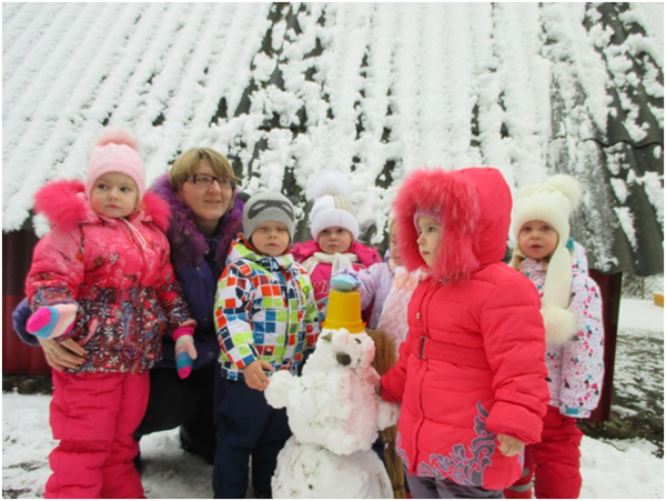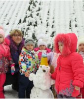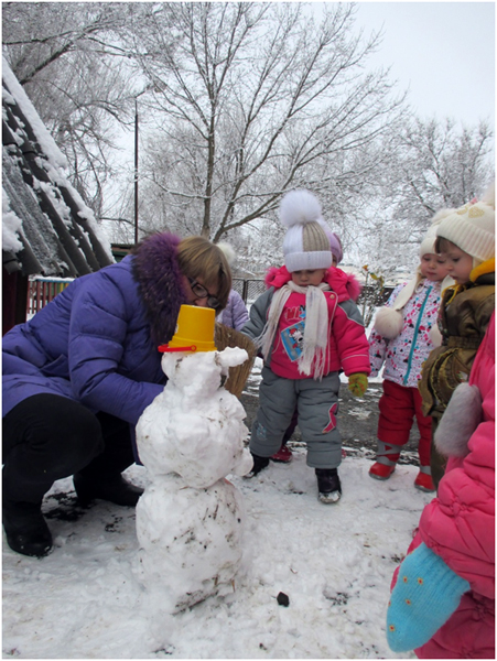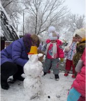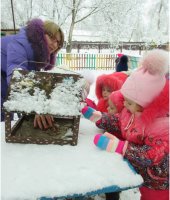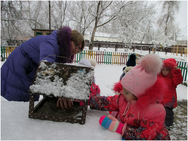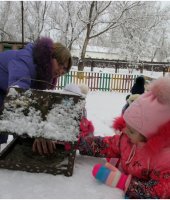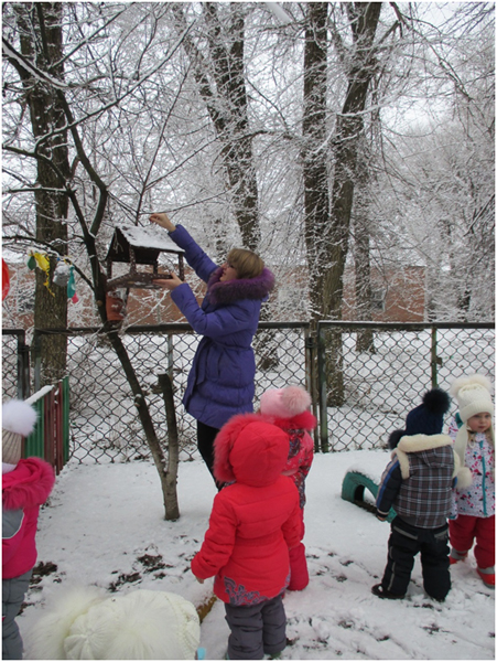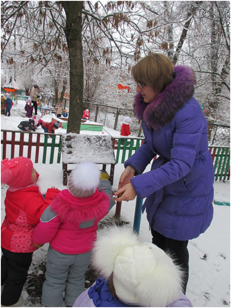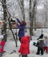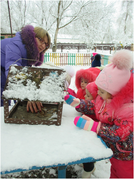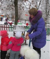 В январе месяце в группе раннего возраста мною была проведена тематическая прогулка «Птицы зимой», с целью формирования у детей желания заботиться о зимующих птицах. В ходе прогулки я детям рассказала, что зимой птичкам голодно и поэтому надо их подкармливать зернышками и крошками. Дети с большим удовольствием имитировали движения птиц и их голоса. Затем отгадали загадки про ворону и воробья. А так же предложила ребятам покормить птиц, насыпав зерно в кормушки. Дети сначала рассмотрели следы птиц, которые прилетают к кормушке, а затем по очереди насыпали корм в неё. После наблюдения за птицами мы все вместе слепили снеговика, который помог нам закрепить знания о зимних забавах.