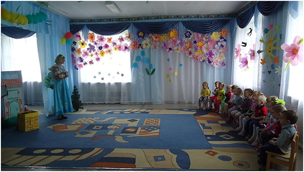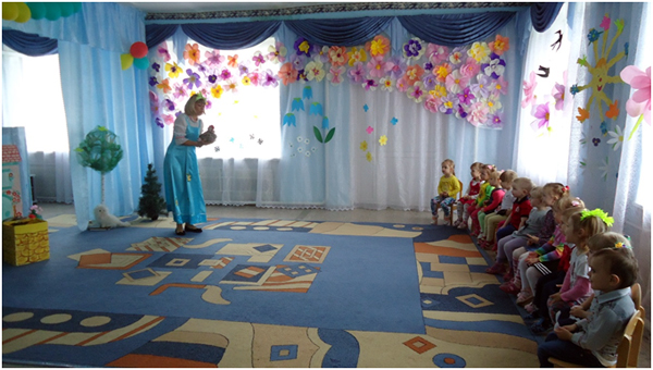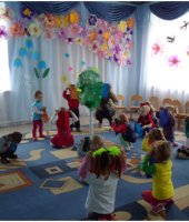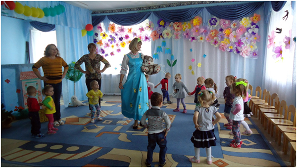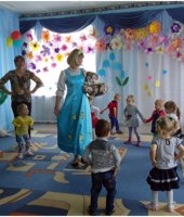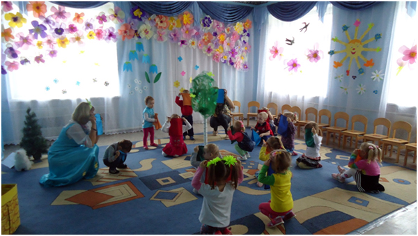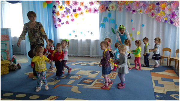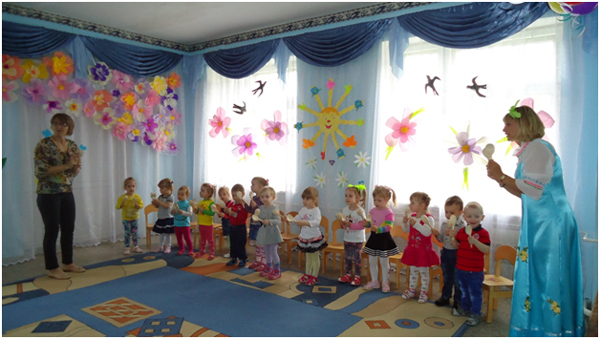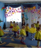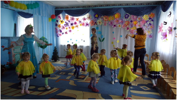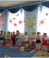 Итогом тематической недели «В гостях у домашних животных» для детей группы раннего возраста стало развлечение «Солнышко пришло». На праздник к детям пришла Машенька из сказки «Маша и медведь». В своем волшебном коробе гостья принесла ложки, на которых дети играли в оркестре и разноцветные платочки, с которыми дети танцевали танец. А вот ленточки из короба превратили наших деток в лошадок и они с интересом инсценировали песенку «Накормлю свою лошадку». Мальчики под народную музыку катали девочек, что доставило много радости ребятам. Хоровод возле русской березки помог детям увидеть красоту весенней природы. Развлечение доставило много радости детям.