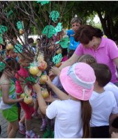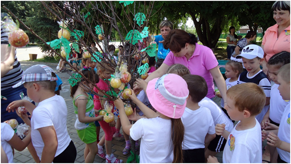 В конце был сюрпризный момент – лето для любимой детворы приготовило щедрые дары. Появилось чудо-дерево, на котором «растут» яблоки. Все участники праздника водили хоровод «Чудо-дерево» на мелодию песни «Чунга-чанга», а затем угощались волшебными яблочками с «Чудо дерева». И все команды были награждены грамотами и методической литературой по правилам дорожного движения.