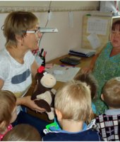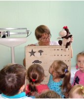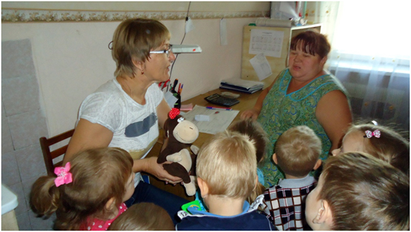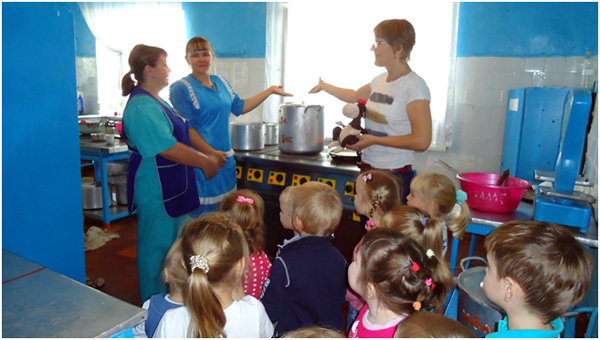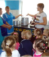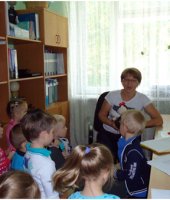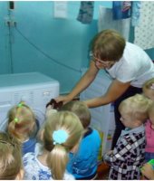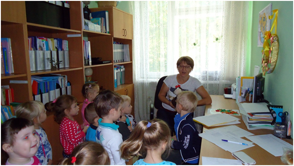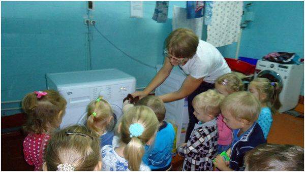 В сентябре месяце у нас в детском саду № 33 «Светлячок» проходила неделя «Наш любимый детский сад», на которой я с детьми младшей группы разучила пальчиковую гимнастику «Наша группа», играла в дидактическую игру «Кто что делает?». Дети составляли предложения по картинке с изображением работников детского сада. Интересна прошла беседа – рассуждение «Какие опасности могут встретиться в детском саду?». А обобщением этой недели была организация экскурсии по детскому саду. Ребята побывали в мед.кабинете, где закрепили представления о необходимости и значении труда медсестры в детском саду. Посетив кухню, дети познакомились с поварами детского сада и поблагодарили их за вкусные обеды, а вот на прачечной дошколята ознакомились с электроприборами и закрепили правила техники безопасности с ними. Конечно, дети с удовольствием осмотрели кабинет завхоза и увидели, где и как хранятся необходимые вещи для пребывания детей в детском саду. Во время экскурсии дети осмотрели кабинет методиста и узнали, что этот кабинет содержит много книг, картинок, плакатов, которые используют воспитатели в своей работе. Завершением нашего путешествия по детскому саду было посещение кабинета заведующего. Там дети узнали, что заведующий руководит работой детского сада, и что у нее много важных дел.