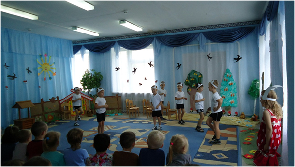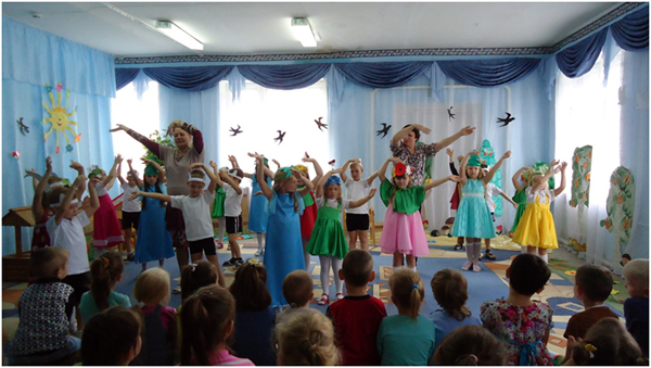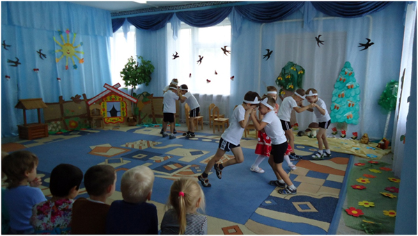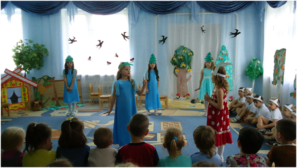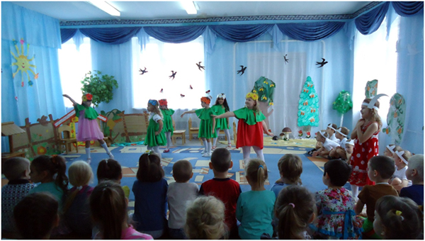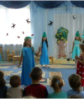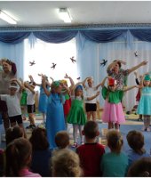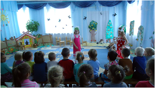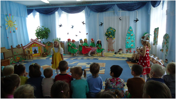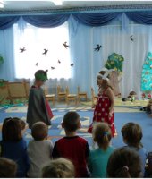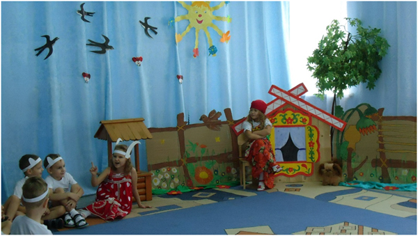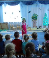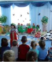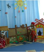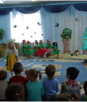 Вот и подошёл к концу первый месяц осени, и, не смотря на ненастье, всё же нам удалось порадовать наших ребят. Сентябрь мы завершили спектаклем, вернее музыкальной сказкой, которую подготовили дети подготовительной группы, в рамках кружка «В театре нашем для вас поём и пляшем». Её показали детям среднего и старшего дошкольного возраста по теме: «Как коза избушку построила». Постановка вызвала большой интерес у маленьких зрителей. Они смотрели сказку с необычайным вниманием и сосредоточенностью. Я думаю, что такой интерес был вызван тем, что главные герои не только произносили свои слова, они так же и пели свои песенки, а остальные персонажи («цветы», «козлята», ёлочки») исполнили интересные характерные танцы. Дети очень любят театр, особенно им интересно, когда играют роли такие же дети, как и они. На прощание зрители бурно аплодировали юным актёрам и сказали, что придут ещё! Я думаю, что это самая большая похвала как для меня, так и для ребят, игравших в спектакле.