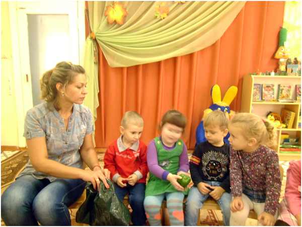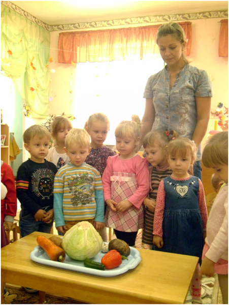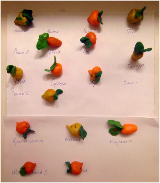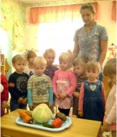 В соответствии с годовым планом МБДОУ на 2016-2017 учебный год в нашем учреждении с 26 – 30 сентября совместная работа с детьми осуществлялась по тематической недели «Дары осени». На протяжении всей недели я с детьми младшей группы проводила беседы на темы: «Сад, огород», «Что растет на грядке?», «Фрукты». Рассматривали с воспитанниками сюжетные картины из серии «Что нам осень подарила», муляжи овощей, фруктов, натуральные овощи. Играли с детьми в игры «Чудесный мешочек», «Съедобное – несъедобное», «Картинки половинки», лепили по теме: «Репка». В ходе проведения данной недели младшие дошкольники закрепляли свои знания об овощах и фруктах, а так же умения в лепке овощей и фруктов.
