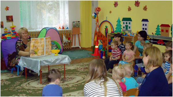 Далее хозяюшка при помощи кукольного театра рассказала историю о том, как потерялся утёнок. По звукопроизношению ребята угадывали животных: лягушку, козу, собачку, петушка. Дети прослушали стихи, потешки и вместе с педагогом называли, кто как кричит. Сколько удовольствия и восхищения было на лицах детей.