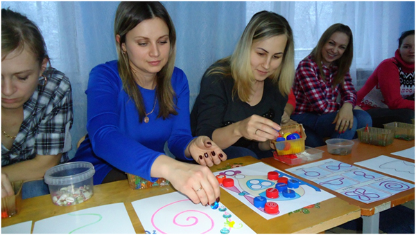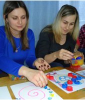В заключении мастер-класса мы перешли к практической части и родители выполняли различные игры и упражнения, способствующие развитию мелкой моторики с использованием массажных ковриков, крупных бигуди, прищепок, резиночек для волос, пуговиц, монет, пробок, пинцетов, палочек для суши и других предметов.