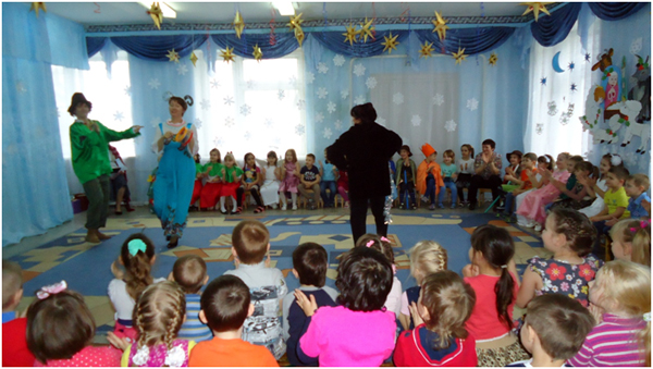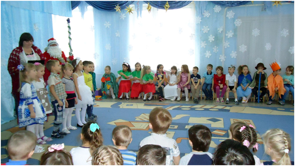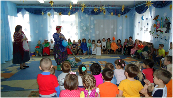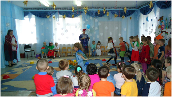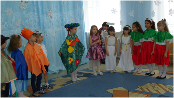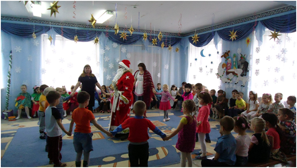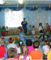 К празднику Рождества с давних времён готовились в каждой семье. Это очень радостный праздник. Люди веселились и ликовали, узнав о рождении Божественного младенца Иисуса Христа, который вырастит и принесёт людям счастье и радость. В нашей большой семье, в детском саду тоже готовились к этому празднику: учили частушки, песни, стихи, колядки. Погостили дети в русской избе, где их встречала хозяйка. Она рассказала про красивый город Вифлеем, о добрых людях Иосифе и Марии, о рождении чудесного Младенца Иисуса Христа. Зима не только самое долгое время года, но и самое богатое праздниками. Один из таких - Новогодние святки. В этот день самым весёлым развлечением было ряжение. Любимыми персонажами были медведь, коза и Цыган. Вот к нам и заглянули на праздник эти персонажи. Они веселили нас танцами, частушками, песнями. Появился на празднике и Дед Мороз снежок сеял, посевал с праздником всех поздравлял с рождеством и Новым годом. Дед Мороз играл с детьми в разные весёлые игры. Подарил детям подарки, но здесь не обошлось без коварства Бабы Яги. Она завлекла игрой «Полётом на мётлах», а сама тем временем украла мешок с подарками, заколдовала Хозяйку, но дети позвали Деда Мороза и он всё исправил. Получив подарки и массу радостных впечатлений, дети попрощались с Хозяйкой и пообещали на следующий год заглянуть опять в русскую избу.