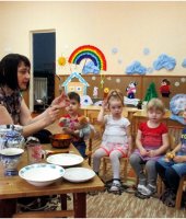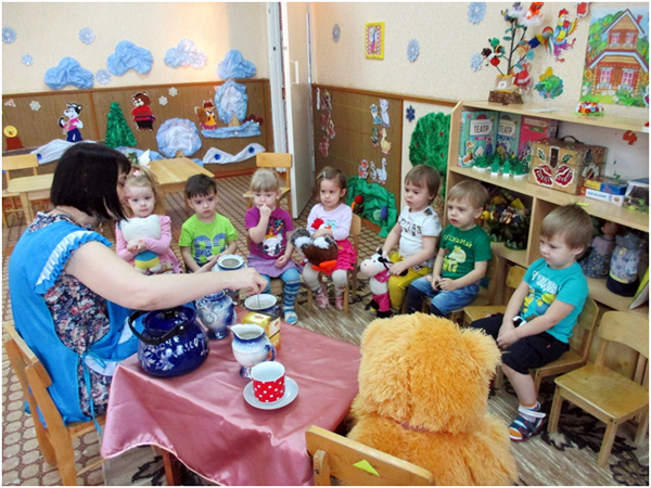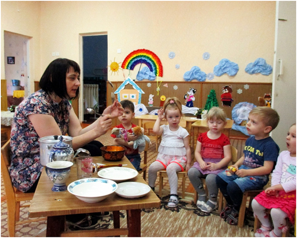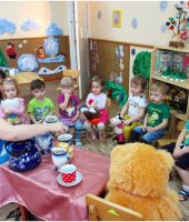 В группе раннего возраста прошла тематическая неделя «Чудеса в решете». В ходе этой недели мы с детьми рассматривали посуду. Учились составлять рассказ о посуде. Я рассказала мишутке и ребятам о чайной посуде и показала, как надо заваривать чай. Рассмотрели кастрюли и сравнили их по размеру. У бабушки Федоры были в гостях и рассмотрели столовую посуду. Показала детям, что посуда бывает деревянная, стеклянная, глиняная, алюминиевая. В конце недели я провела продуктивную деятельность по теме «Тарелочки для мишек». В ходе этого мероприятия дети учились раскатывать шар из пластилина, потом его расплющивать, чтобы получилась тарелочка для мишки. Мишутка поблагодарил ребят за помощь.
