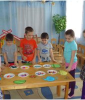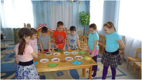 На занятие в гости к детям пришла Федора из сказки К.И. Чуковского «Федорино горе» и пожаловалась на свою беду. Дети откликнулись на её просьбу, и с удовольствием согласились помочь. Ребята рассказали Федоре о видах посуды; материалах, из которых её изготавливают; помогли расставить чайную, столовую и кухонную посуду на полки; разгадывали загадки; находили лишние предметы посуды в буфете; с лёгкостью определили какая посуда спряталась (в контурном и силуэтном изображении). А напоследок, украсили изображения предметов посуды различными камешками, монетами, пуговицами и др. мелкими предметами.