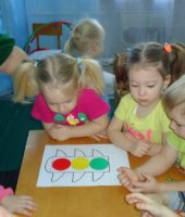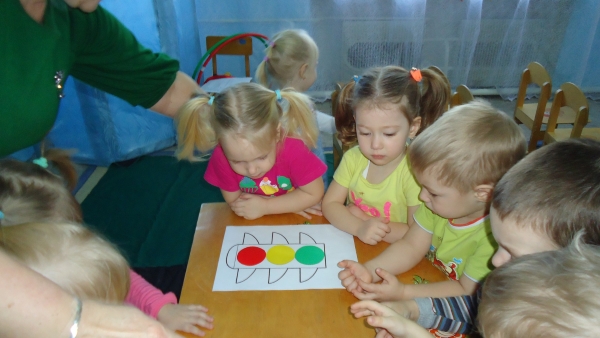 Наконец прибыли к месту назначения, но светофор не мигал своими глазищами. И тогда с помощью дидактической игры "Собери светофор" дети смогли познакомиться с Мигалкой. Он рассказал ребятам о значении самых главных цветов светофора. Знания закрепили в игре "Найди свой цвет". Объяснил малышам для чего нужна "зебра" и как и с кем нужно переходить улицу. Слова светофора Мигалки: