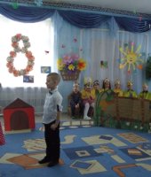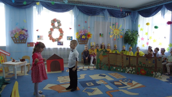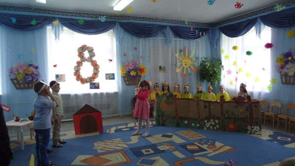 В канун праздника 8-е марта, на праздничном утреннике, в рамках моей кружковой работы, мы с детьми подготовительной группы представили нашим гостям музыкальную сказку «Про волшебника Оха и Дуню-ленивицу». И хотя в моём кружке только 12 человек, но я решила в этот раз, одновременно задействовать в представлении всех детей группы. Роли были самые разнообразные. Ребята с удовольствием их играли, а так же исполняли сольные партии и танцевальные миниатюры, входя в образ данных персонажей. Сказка получилась масштабной и интересной. Особый эффект от просмотра доставили и декорации, и музыкальное оформление. Сказка очень понравилась не только детям, но и родителям. Дети играли, как настоящие актёры, за что и были вознаграждены бурными аплодисментами от зрителей.