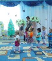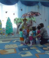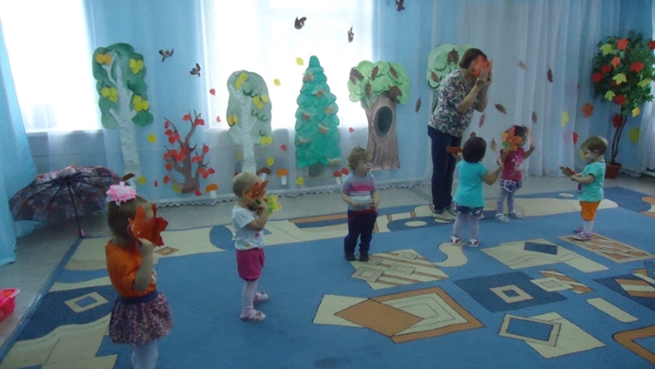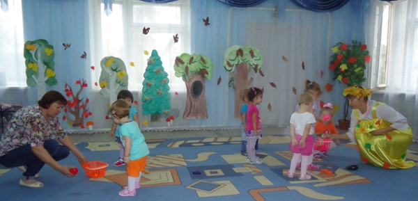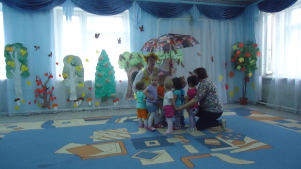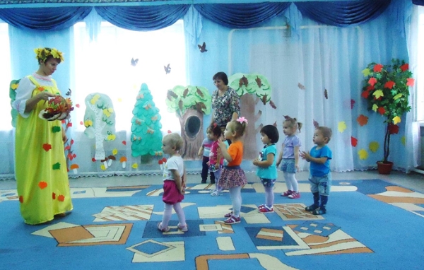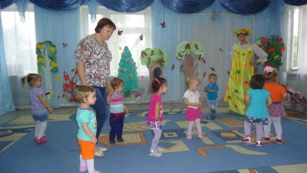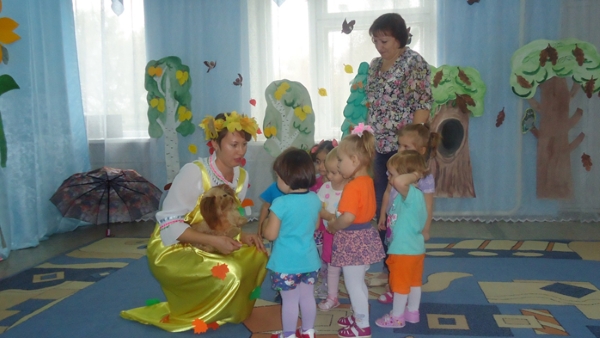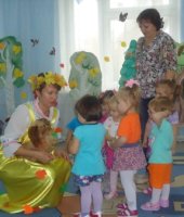 Праздник – яркое и радостное событие в жизни детей, которое обогащает мир детей разнообразными художественными впечатлениями. В этом году у ребят ранней группы прошёл первый их праздник в детском саду – «Осень в гости к нам пришла». В гости к ребятам приходила красавица-Осень (в роли Осени выступила инструктор по физическому воспитанию Улевская Н. Г.) и собачка Жучка (мягкая игрушка). Вместе с ними ребята играли (собирали листочки, прятались от дождика, собирали овощи в корзиночки), танцевали («Танец с листочками» и «Весёлую пляску»), а ещё мы все вместе, конечно в основном взрослые, так как малыши ещё не совсем могут говорить, а тем более петь, и тем не менее для наших гостей мы спели песенки («Осень» и «Собачка Жучка»). На прощанье Осень подарила ребятам свои сочные наливные яблочки.