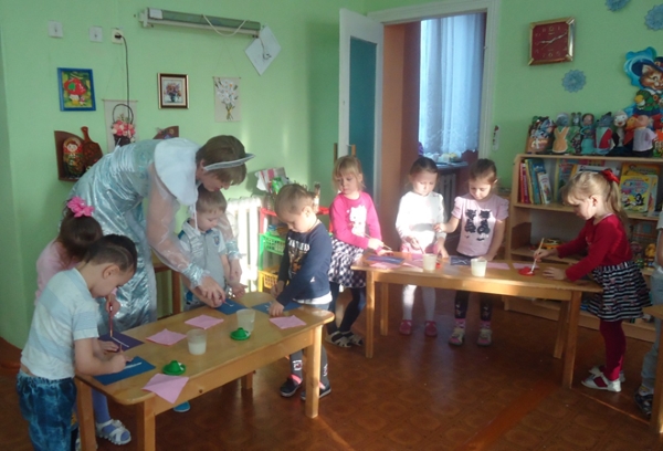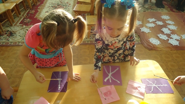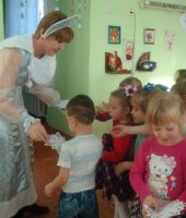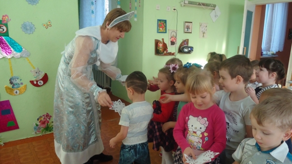 В ходе занятия к ребятам пришла Снегурочка и принесла снег, за которым дети наблюдали в течение НОД. Зачем Она загадала загадки о зиме. А ребята рассказали Снегурочке: «Какая погода бывает зимой?», используя в своей речи разнообразные эпитеты. Рассмотрев шестилучевую снежинку, ребята решили устроить снегопад из своих нарисованных снежинок. С большим интересом ребята трогали лед, а затем рассказывали его свойства. В конце занятия ребята рассказали о свойствах снега, льда и сделали вывод, что холодной зимой снег укрывает землю и под снежным покрывалом зимуют растения, насекомые, снег помогает им пережить сильные морозы. Лед толстым, прочным слоем покрывает водоемы, чтобы все живое не погибло от холода.