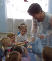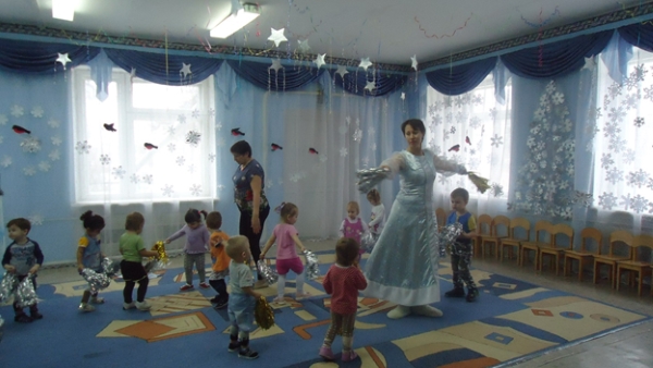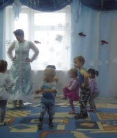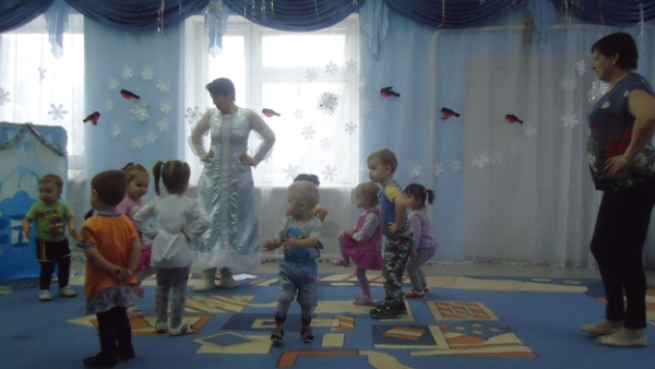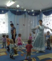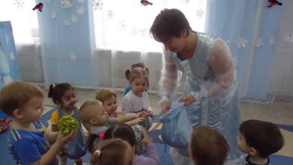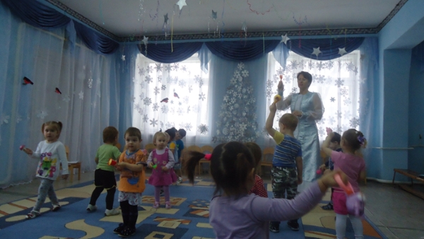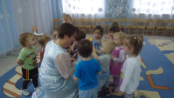 Сегодня мы с ребятами ранней группы ходили в гости к тётушке Зиме. Она встретила нас тепло, научила, как можно согреется и не замёрзнуть на морозе. Вместе с зимой ребята слушали музыку, делали фонопедическое упражнение «Вьюга», пели песенку. А ещё тётушка Зима приготовила для ребят сюрприз – волшебные мешочки. Дети отгадывали, что там лежит и весело танцевали с погремушками и играли со снежками. Хорошо в гостях, да дома лучше. Пришло время расставаться. Ребята попрощались с тётушкой Зимой и с сожалением покинули её «владения», но обещали прийти ещё.