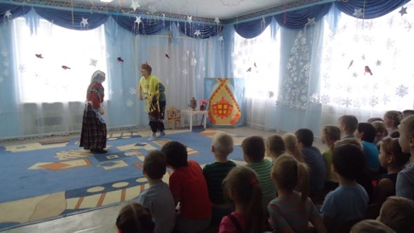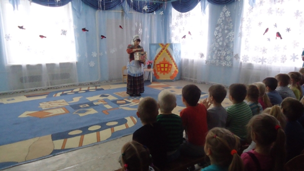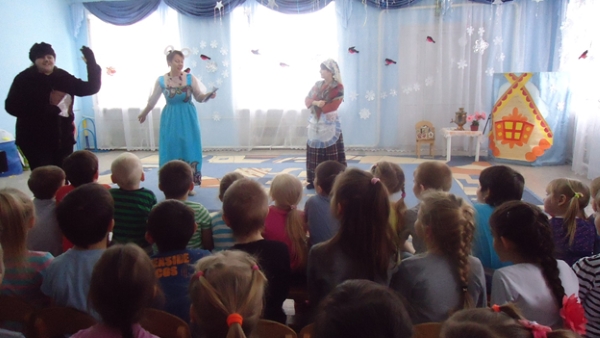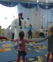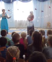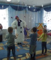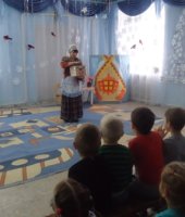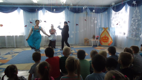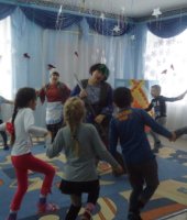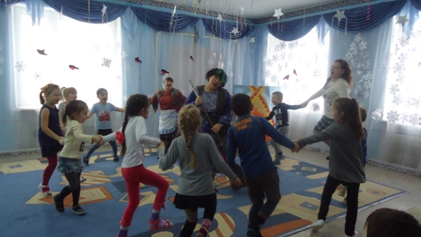 В этом году мы с ребятами ходили в гости к тётке Марье. Как и полагается, для хозяйки спели колядки, за что она дала ребятам гостинцы. А ещё показала нам свой волшебный сундучок, в котором лежали загадки, игры и снежная перина. Загадки ребята отгадали, за что и получили по связке баранок с самовара тётки Марьи, играли в игры: «Старушка-завидушка» и «Углы», а когда хозяйка потрясла перину, то появилась Снежная баба, которая тоже поиграла с ребятами. В такой праздник не обошлось и без нечистой силы – чёрта и бабы Яги, но хозяйка их быстро прогнала. Приходили и ряженые (Коза и Медведь), повеселили ребят, поиграли, и всякого добра пожелали.