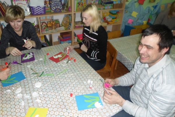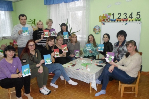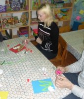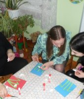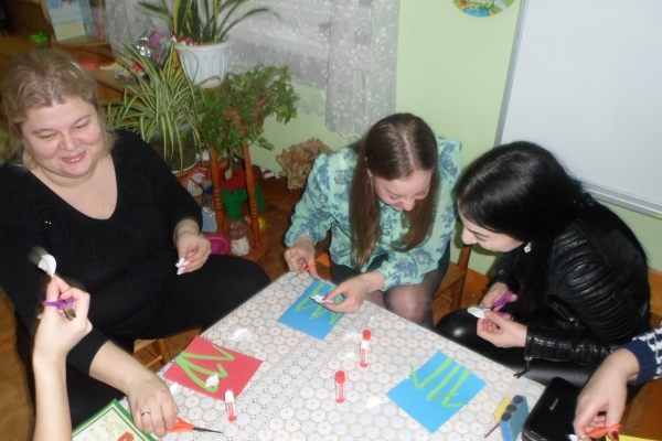 Затем мы с родителями перешли к практической части. На столах были приготовлены цветная бумага, клей, ножницы, салфетки картон. Родителям нужно сделать аппликацию из ватных дисков «Подснежник». С азартом и увлечением родители сначала вырезали подснежники из ватных дисков, а затем из предложенных материалов «оживляли» свои работы. У родителей было желание творить, развивать художественно-творческие способности.