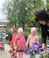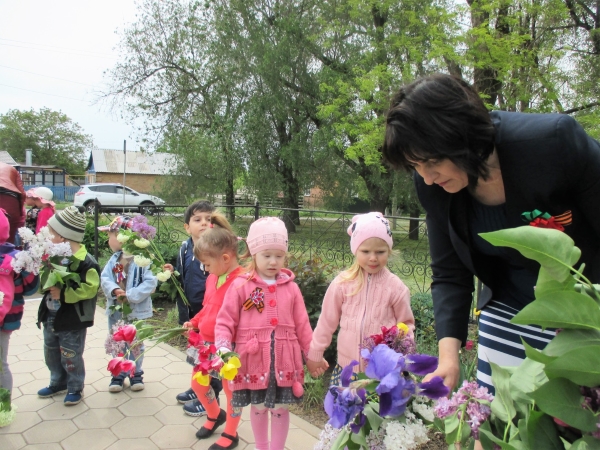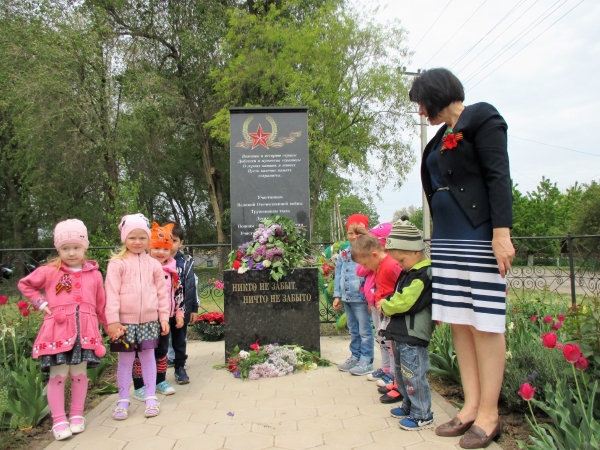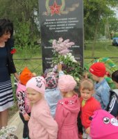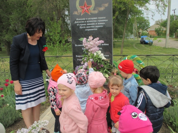 С целью воспитания у детей младшего дошкольного возраста уважения к историческому прошлому своего народа на примере подвигов, совершённых в годы Великой Отечественной войны я организовала экскурсию к обелиску. Где ребята возложили цветы, прослушали стихотворение «Обелиск» и рассказ о защитниках нашей станицы. А так же почтили память погибших героев минутой молчания.