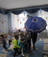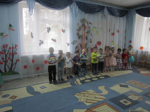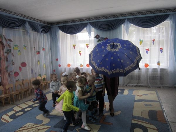 С яркими осенними листочками, с ложками дети с Осенью исполнили весёлые танцы. Малыши танцевали от души. Дети, как никто другой, способны радоваться золотистым опавшим листьям под ногами и дождичку, под которым так интересно погулять под зонтиком. Осень с малышами играла в игру: « Солнышко и дождик», предложила собрать хитрые грибочки «Собери грибочки», которые спрятались в лесочке. В конце праздника Осень угощала детей наливными яблоками. Первый праздник с родителями удался.