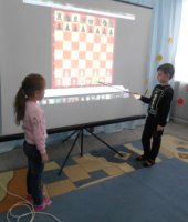 Я знакомлю детей с латинскими буквами, их написанием и названием. На шахматной доске используется множество вариантов упражнений и игр с отдельными фигурами, каждый участник «по кругу» пробует свои силы.