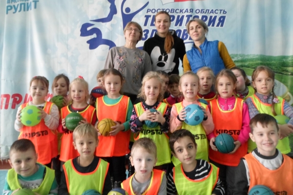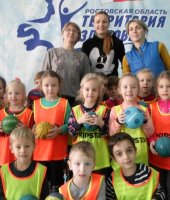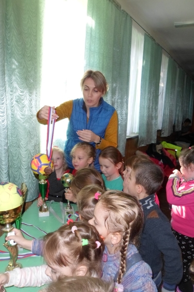 Ирина Сергеевна провела нас в зал, где занимаются гандболом. Детям рассказали все об этом виде спорта. Ребята с интересом рассматривали оборудование, примерили на себя манишки, подержали в руках гандбольные мячи.