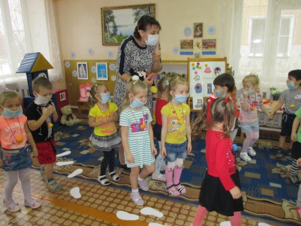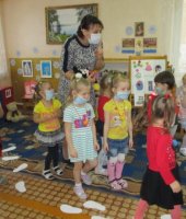 Ребята отправились выручать мышонка Мики ,которого забрала в своё ледяное королевство «Микробов» злая Простуда. Дети играли в игру «Да-нет», провела разминку «Мы погреемся немножко» и самомассаж «Неболей -ка». Вместе с детьми пришли на поляну «Тёплых вещей», где закрепили умение группировать одежду и вспомнили алгоритм одевания на зимнюю прогулку. Затем ребята попали на поляну Витаминов .Здесь ребята отгадали загадки об овощах и фруктах. И получили в подарок чесночный медальон. Передвигаться по королевству «Микробов» дети должны были в марлевых повязках, с целью защиты организма от микробов.
