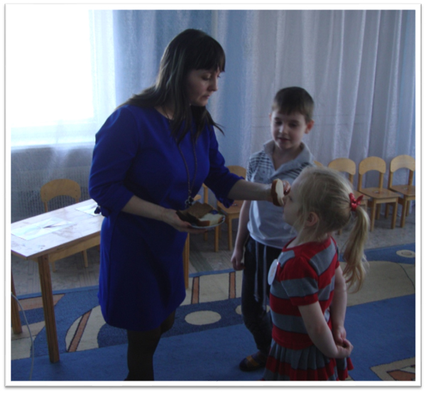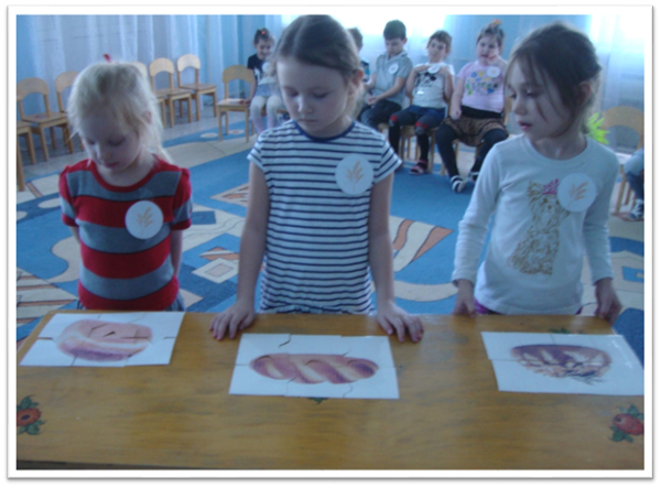 Дети продолжали пословицы подходящим словом, составляли «семейку слов», разгадывали загадки, собирали разрезные картинки с изображением хлебобулочных изделий, выкладывали мельницу из счётных палочек. Отличились и капитаны команд, они без труда определили на вкус и по запаху пшеничный и ржаной хлеб. А в конце досуга ребят ждало угощение, ванильные сушки, которые оказались вкуснее обычного.