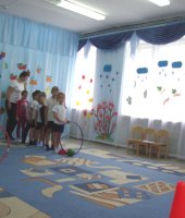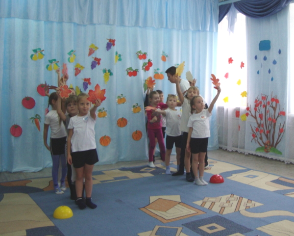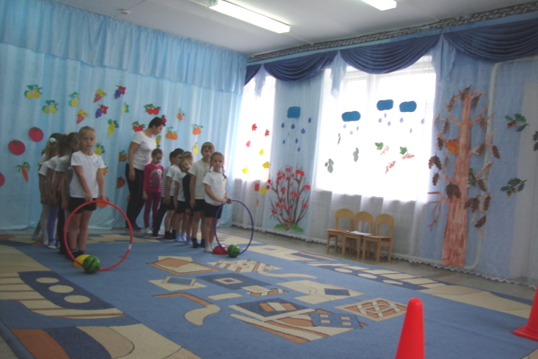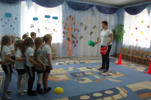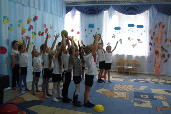 Ребята блестяще ответили на все поставленные вопросы. Затем я разделила детей на две команды: «Осенние листочки» и «Капельки», и мы провели весёлые яблочно-овощные состязания
