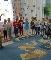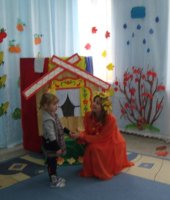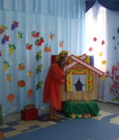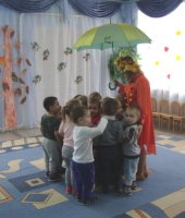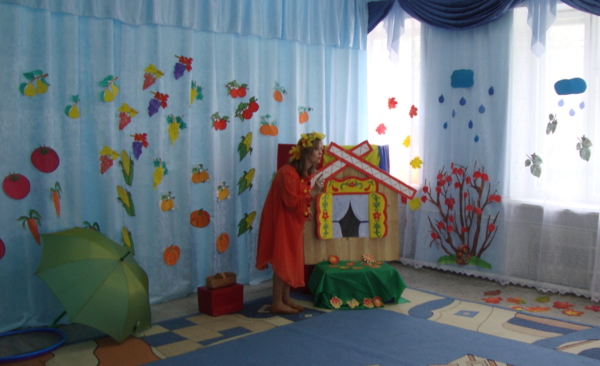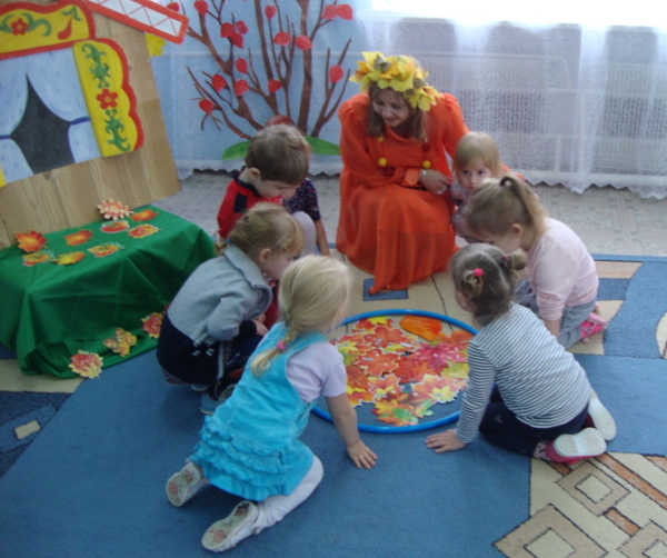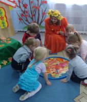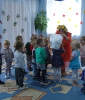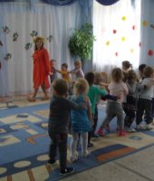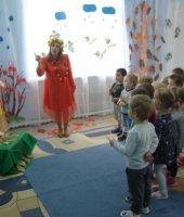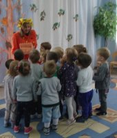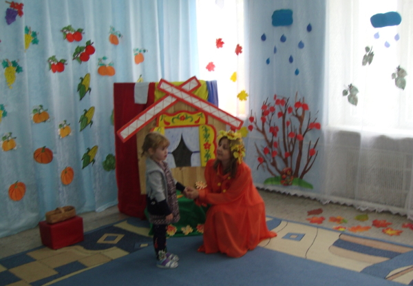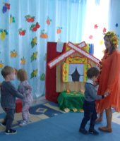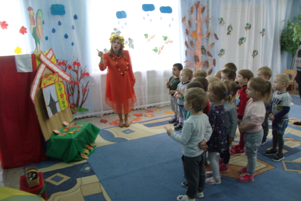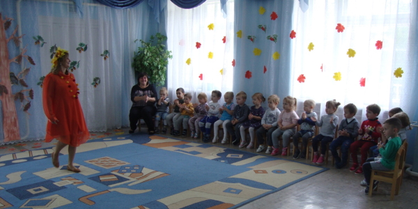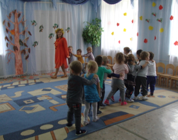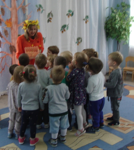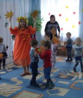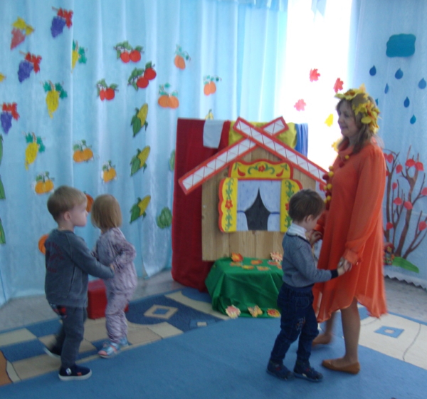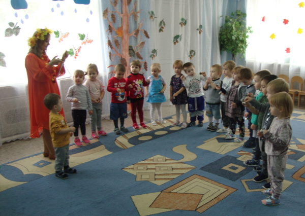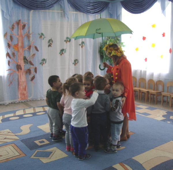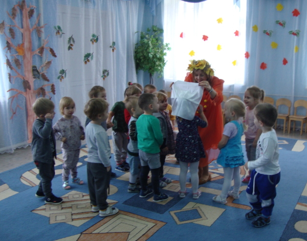 В начале октября я провела с детьми младшей группы праздник «Вот и осень к нам пришла». В гости к ребятам приходила Осень. Она пригласила нас в осенний лес, полный чудес. Для Осени ребята спели песенку, прочитали ей стихотворения. Затем вместе с Осенью позвали в гости Петушка, которого так же порадовали и спели песенку для него. Петушок подарил детям разноцветные листочки, с которыми они весело потанцевали и поиграли, а когда неожиданно «пошёл дождик» все спрятались под большой зонт. После дождя ребята вместе с Осенью потанцевали, поиграли на музыкальных инструментах, а потом Осень с нами поиграла в игру «Волшебный платочек», под которым прятались ребята, а в конце праздника «волшебный платочек» подарил ребятам осенний подарок – яблочки.