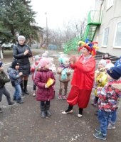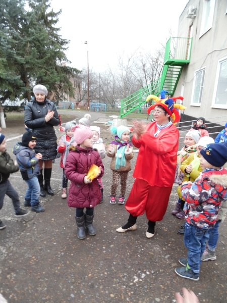 Ведущий - скоморох, (в роли которого была я – музыкальный руководитель) пригласил всех на веселое гуляние. Мы с ребятами водили хороводы, играли в игры-эстафеты - «Веселый бубен», «Кто дальше бросит валенок», « Перетягивание каната», исполняли песни про Масленицу. Дети активно участвовали в конкурсах, читали стихи, водили хороводы вокруг Масленицы.