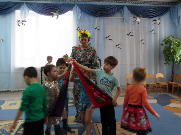 Ребята вместе с Весной водили хороводы, отгадывали загадки, играли в народные игры и кричали «заклички», зазывая весну, исполнили для нее песню «Весенний хоровод», поиграли в народную игру - «Ручеек».