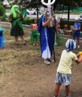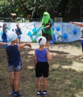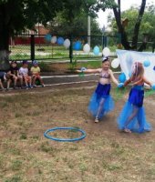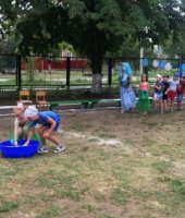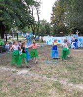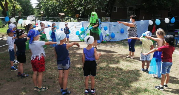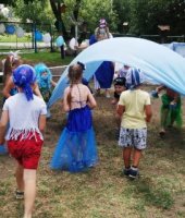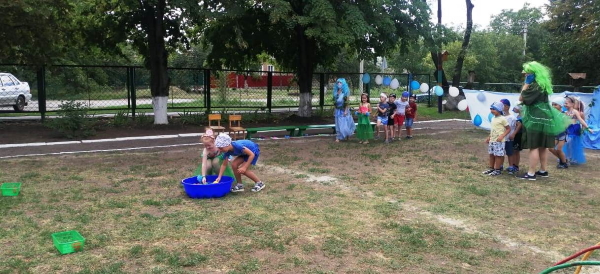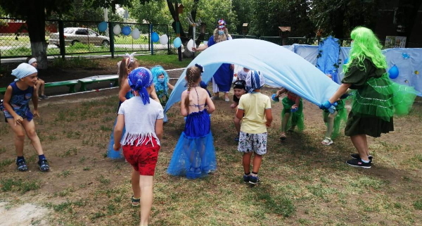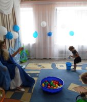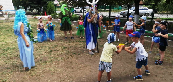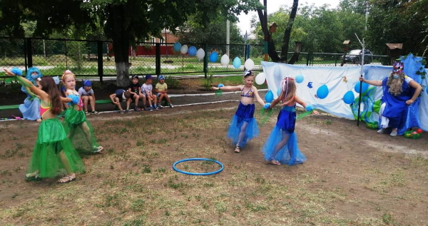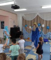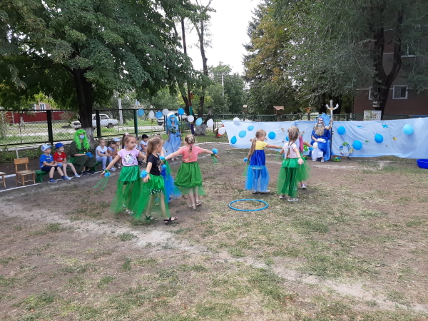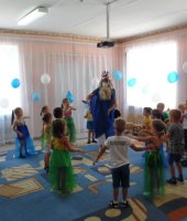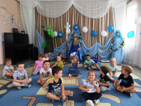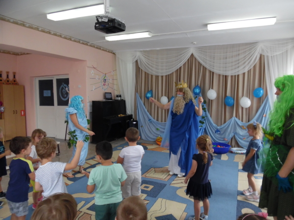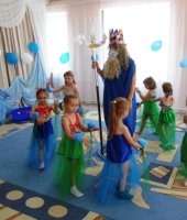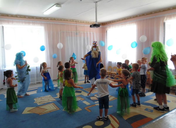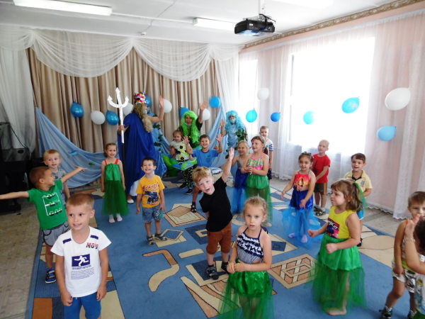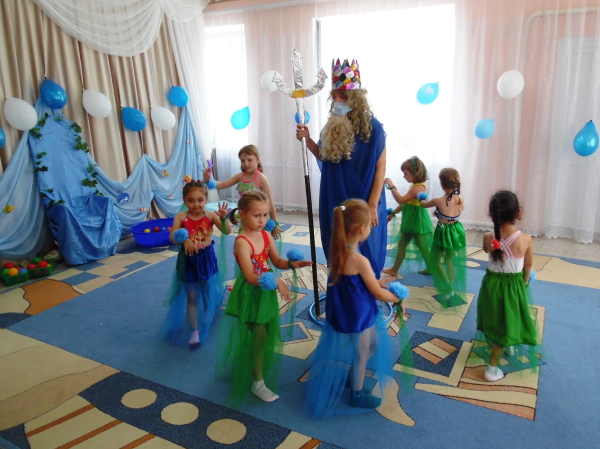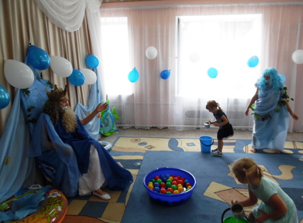Продолжив путешествие, встретили Водяную (в роли логопед Гречиха Л.Н.), которая помогла всем приготовить подарок для царя Нептуна. В подводном царстве она с детворой поиграла в игры «Достань жемчужину», «Плавуны». Царь Нептун предлагал ребятам различные водные игры- эстафеты: «Водоносы», «Удочка», «Передай ведерко», «Нептун и ладошки». С большим удовольствием дети играли в игры: «Море волнуется», «Морская фигура». Красавицы русалки исполнили великолепный танец «Русалочки».