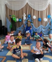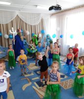 Однако погода не всегда радовала ярким и жарким солнышком, поэтому дети среднего и старшего возраста, встретились с могучим властелином морей и океанов царем Нептуном (в роли воспитатель Локоть Н.Л.) в музыкальном зале. А для ребят из подготовительных групп «Ромашки» и «Ягодки» праздник прошел на спортивной площадке.