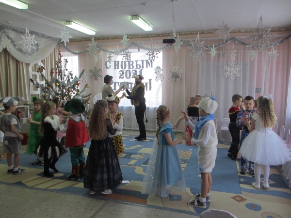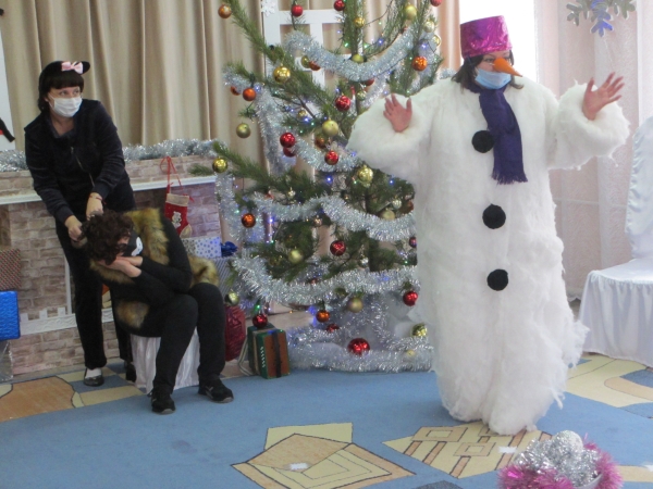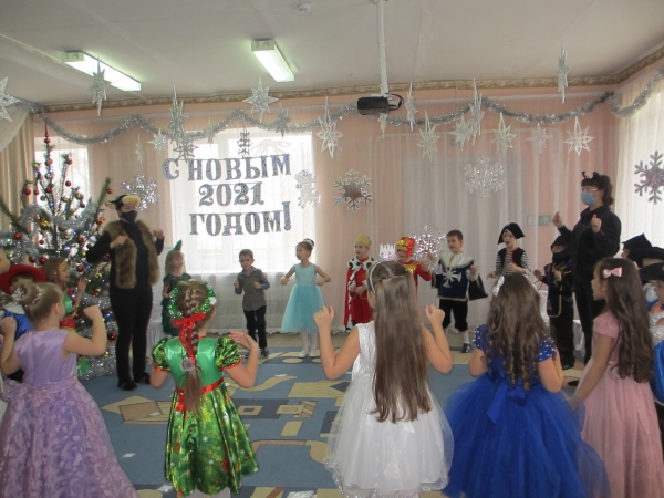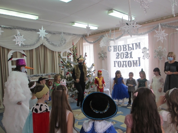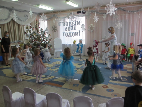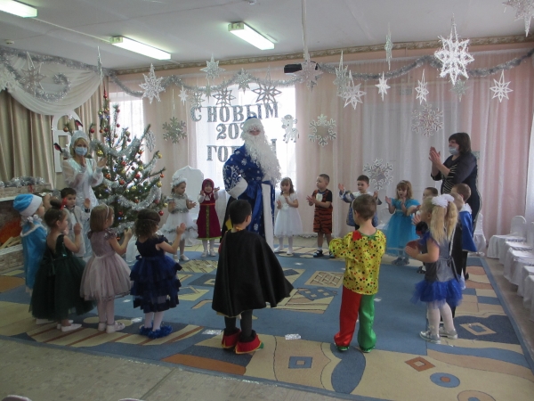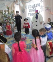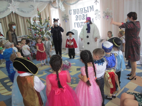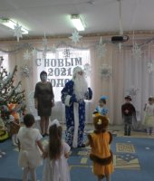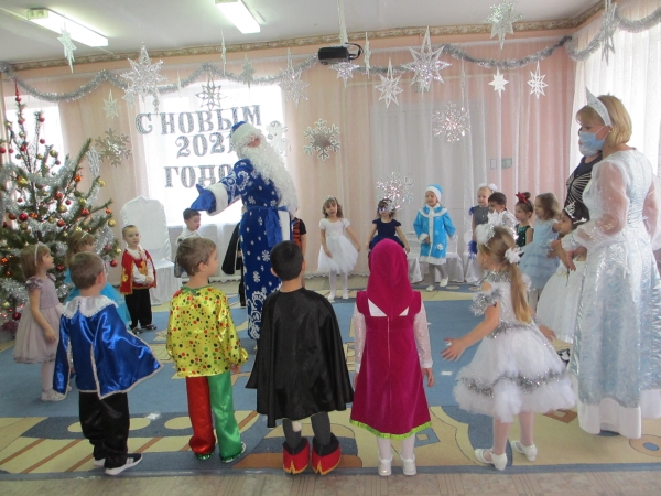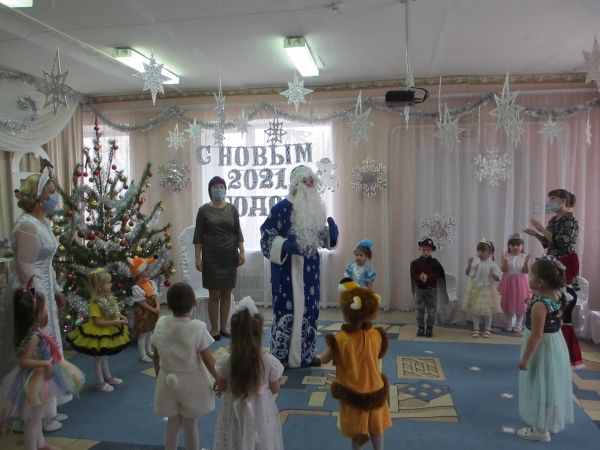В старшей группе «Непоседы» и подготовительных группах «Ромашка» и «Ягодка» с самого начала сказочные герои снеговик - Том (в роли воспитатель Котченко И. А.), бычок - Федя (в роли инструктор по физ. культуре - Улевская Н. Г.), мышка Лулу (в роли воспитатель Михайлова А. А.), увлекли ребят в волшебный мир сказки. Дети смогли окунуться в праздничную атмосферу приключений, поучаствовать в интересных играх. А с появлением Деда Мороза начался настоящий праздник с песнями и танцами, хороводами вокруг ёлки. После представления дети читали стихи Деду Морозу и Снегурочке. Море радости и эмоций у детей вызвали подарки, полученные из рук самого Дедушки Мороза!