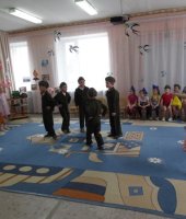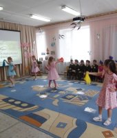 Дети очень внимательно прослушали записи песен. А в заключении нашей встречи воспитанники подготовительной группы «Ягодка» исполнили танцевальную композицию под песню «Катюша», а воспитанники старшей группы и подготовительной «Ромашка» пели песню «Катюша».