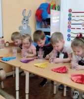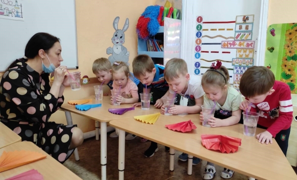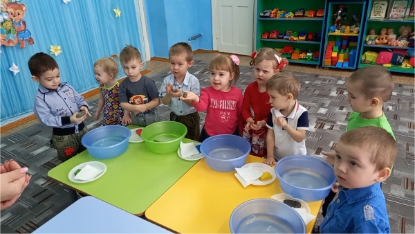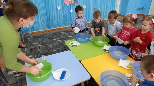 К ребятам младшей разновозрастной группы ОСП «Берёзка» прискакал маленький Лягушонок, он хотел отправиться на бумажном кораблике в путешествие, но кораблик затонул. Воспитатель С.Г. Дударенко Лягушонку и ребятам рассказала о свойствах воды и бумаги, а ещё ребята сами убедились в их свойствах в ходе экспериментирования.