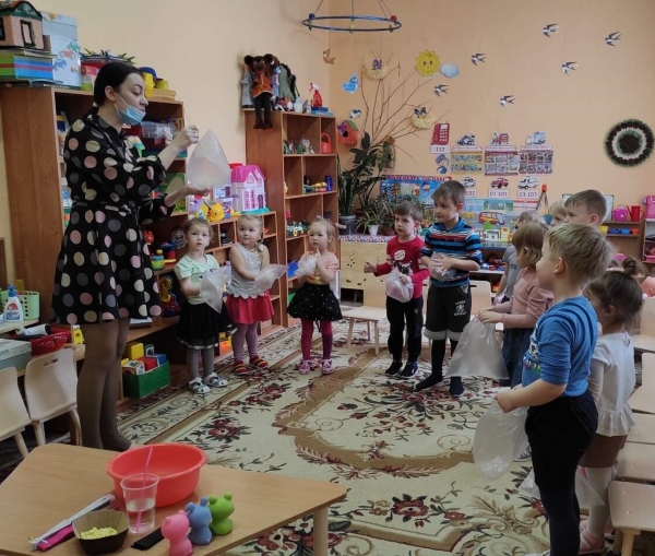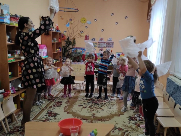 Воспитатель Ю.В. Ковалёва в младшую разновозрастную группу ОСП «Солнышко» принесла целлофановый кулёчек – он был пустой, но большой, что же там было?... Вместе с воспитателем малыши наполнили свои кулёчки воздухом и ещё поучаствовали в опытах с воздухом.
