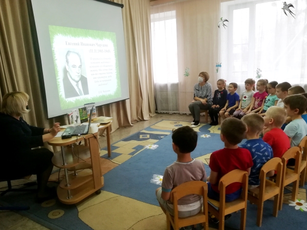 В рамках реализации годового плана работы по преемственности нашего детского сада и Егорлыкской детской библиотеки состоялась встреча воспитанников подготовительных групп «Ромашка» и «Ягодка» с Натальей Петровной Снеговской – заведующей отделом обслуживания детской библиотеки. Встреча была посвящена 120 летию со дня рождения Евгения Ивановича Чарушина - детского писателя, иллюстратора, талантливого художника-анималиста.