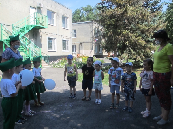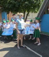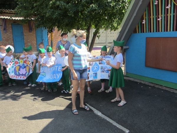 Команда «Эколята» с ребятами подготовительной группы и воспитателем Левиной Е.И. провели экологическую акцию для родителей и сотрудников. Дети с лозунгами, плакатами, голубыми воздушными шарами, листовками, смайликами прочитали стихи о воде и вручили агитационные листовки, призывая всех беречь воду.