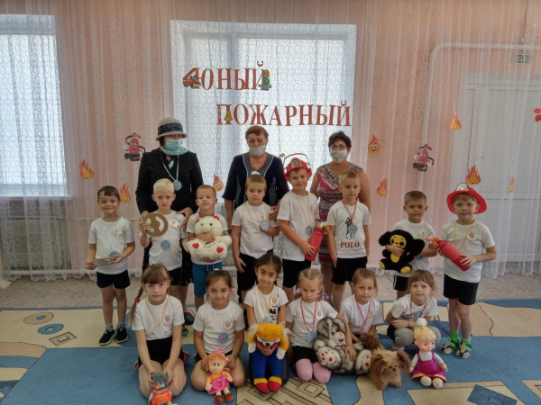 В конце развлечений гости – Огонёк и Шапокляк вручили ребятам медальки «Юные пожарные».