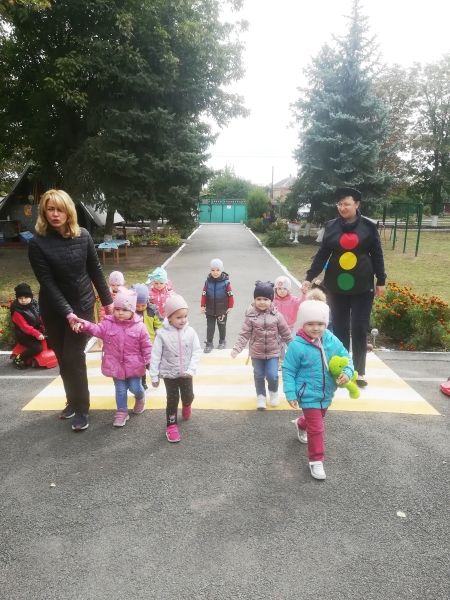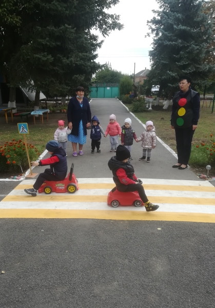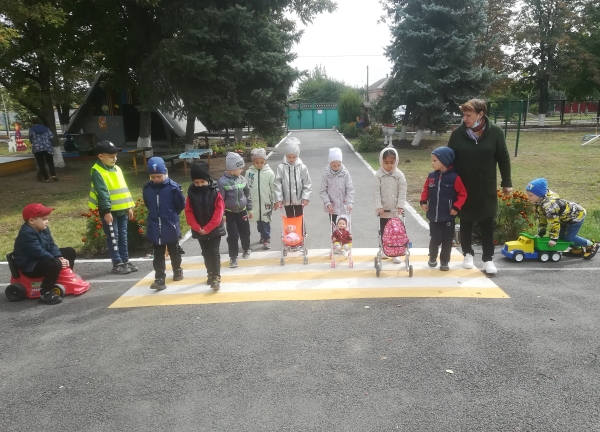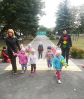 В соответствии с разработанным планом работы МБДОУ «Недели безопасности», воспитатели проводили с детьми познавательные беседы, минутки безопасности («Улица – не место для игр»; «Пешеходный переход», «Зачем нужны дорожные знаки», «Сигналы светофора» и др.). На дорожной разметке детского сада «Светлячок» ребята закрепляли правила перехода проезжей части, и даже самые маленькие воспитанники учились переходить дорогу по пешеходному переходу.