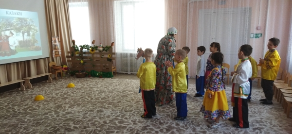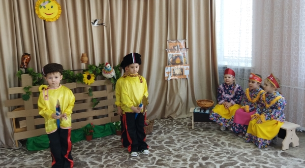 Праздник сопровождался казачьими песнями: «Мы донские казаки», «Как за Доном, за рекой» и др., пословицами и поговорками, загадками на казачью тематику. Девочки старшей группы «Радуга» исполнили озорные частушки.
