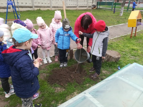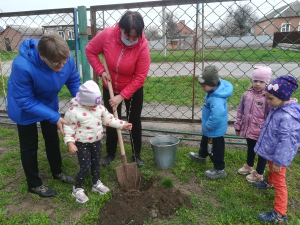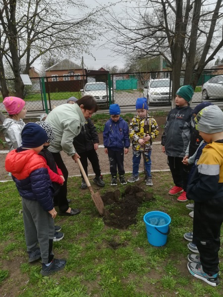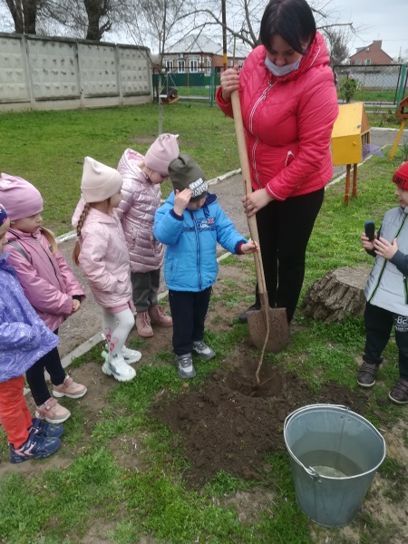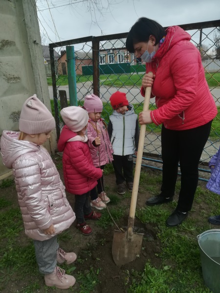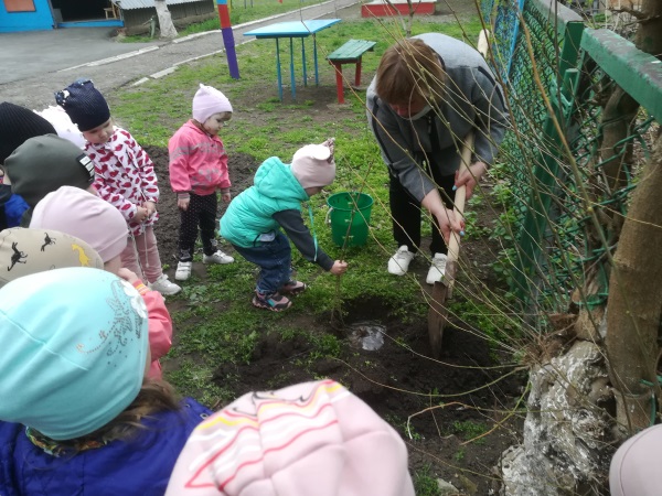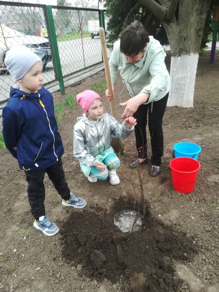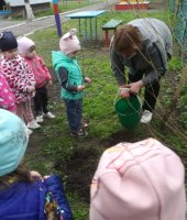 Дети внимательно наблюдали и помогали взрослым в высаживании саженцев. Педагоги предложили детям вести дальнейшее наблюдение, а главное уход за зелеными насаждениями в ДОУ.