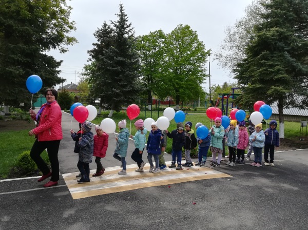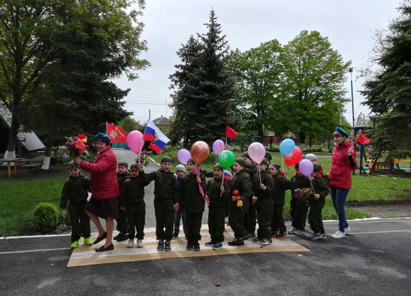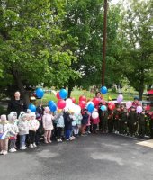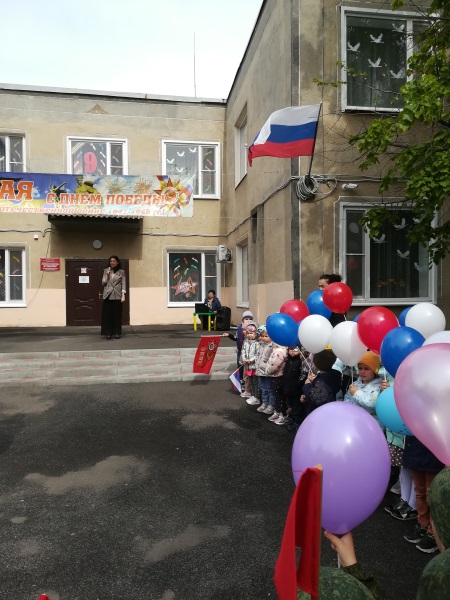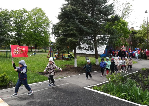 С великим праздником День Победы дошкольников поздравила заведующий МБДОУ Ковалева Ю.В. пожелав всем мирного неба и разрешила начать парадное шествие по площадке детского сада. Каждая возрастная группа с атрибутами: шарами, флажками, цветами под музыку торжественно прошла по территории. Старшие ребята громко прокричали ура!