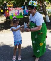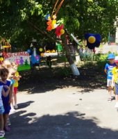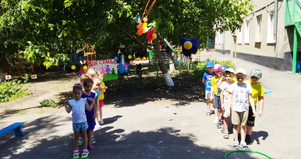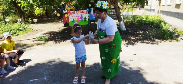 На площадке ребят встретила Ромашка (в роли музыкальный руководитель Ермак Л.В.), которая подарила детям символ праздника - волшебную ромашку с заданиями на ее лепестках.